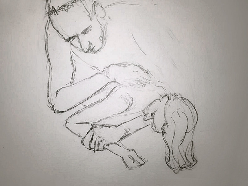 “No hands!” was the plea as we readied to pose after the break. Therein lies the prime challenge for artists drawing duo life models: two models, two faces, four hands, eight limbs… and if the duo is me and Esther, there is going to be quite a bit of intertwining. So, as a kindness to the suffering artists at cave in Pimlico, when we resumed with a seated pose, we attempted to conceal our hands. Having two models was intended to be a Christmas treat, yet at times it may have felt more like a torment…