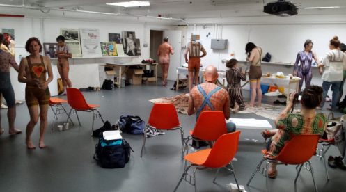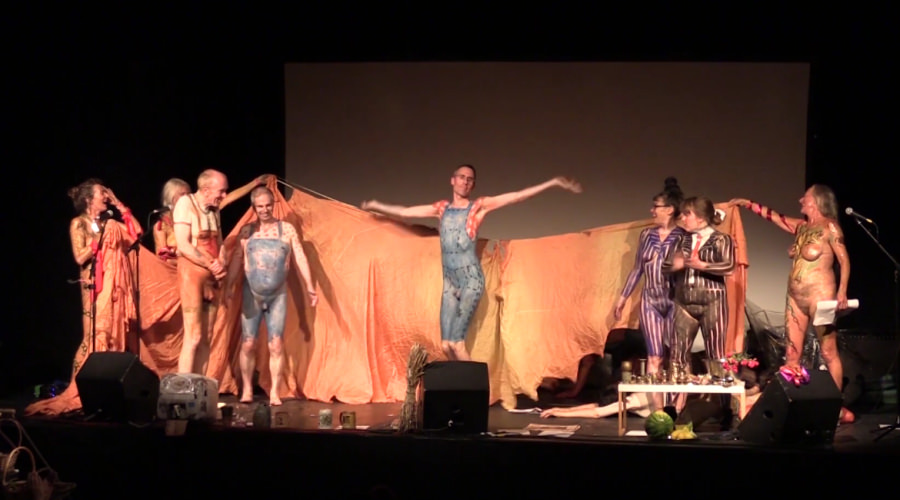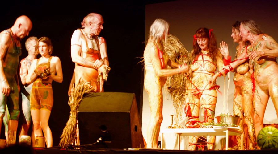 Upon arriving at the ICA we found Christine, already naked and body painted, strolling through the foyer. She and Esther needed no introductions as they’d met in 2012 at a Neo Naturists workshop, so without further ado we were taken to a backstage room where our fellow participants were also fully painted. We’d returned by train that same afternoon from a Spirited Bodies event in Edinburgh and were last to join in. Swiftly we stripped and began painting each other as colourful Neo Naturist farmers.