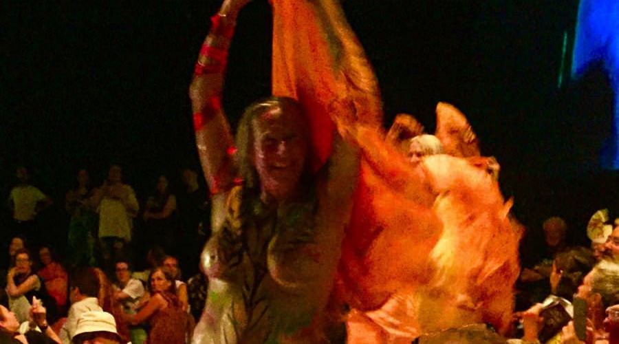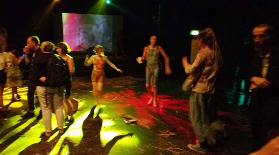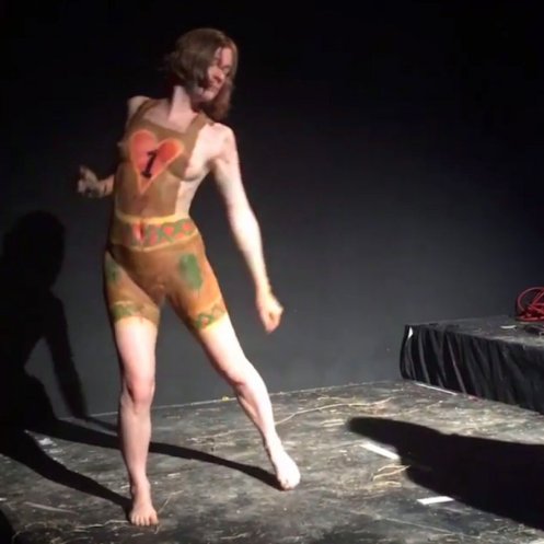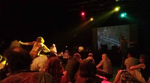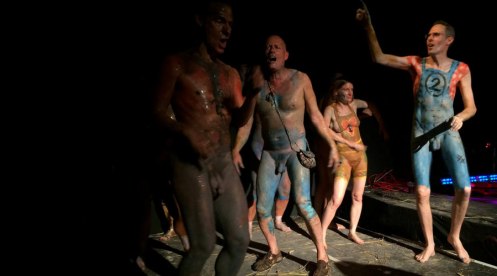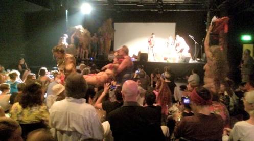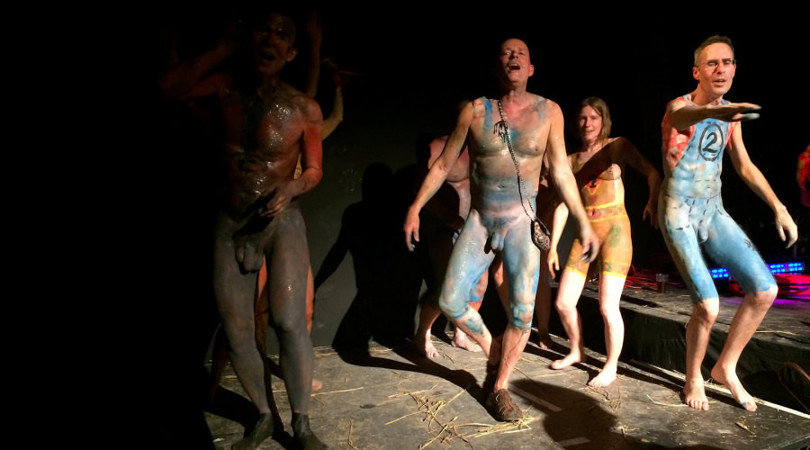 Not only were we latecomers to the body painting, we also missed the Neo Naturists’ talk-through of their ideas for the performance earlier that afternoon, and at a meet-up the day before, but we garnered as much as we could and otherwise relied upon their preference for anarchy to carry us through. Doors opened at 7pm yet our show would not start until around 8:30pm. With time to kill ahead of the opening act, we went out in front of the stage and danced naked amongst the audience.