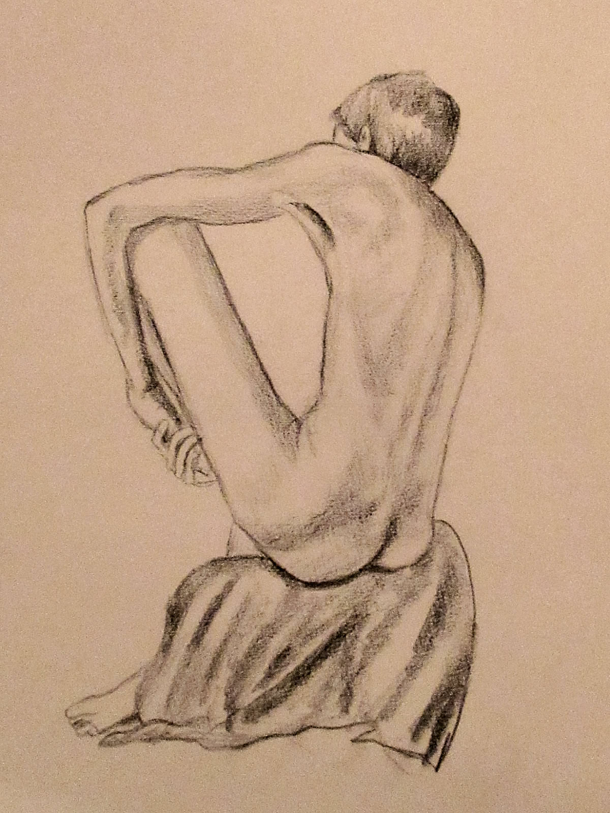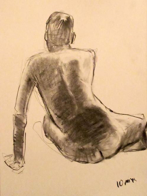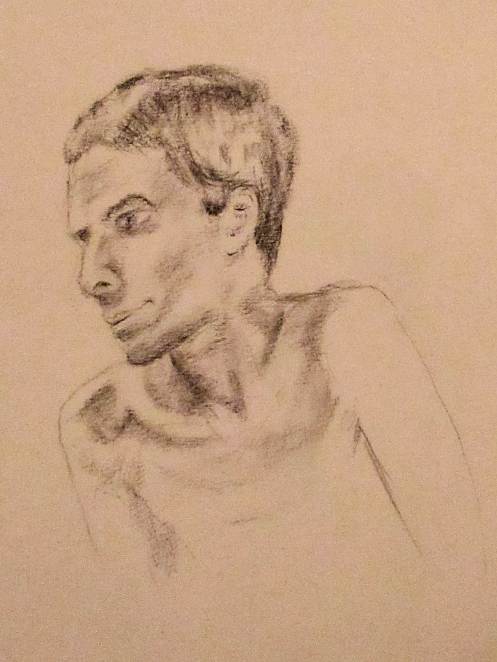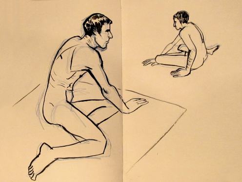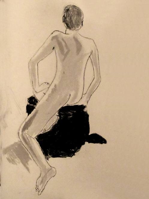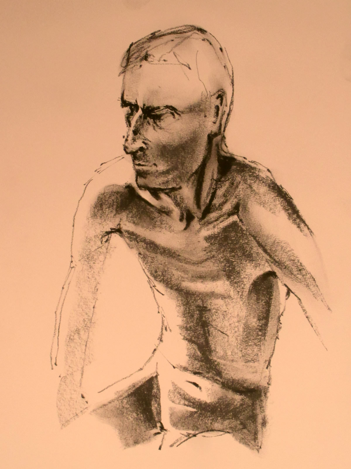 My previous sessions here have either been ‘short poses’, which means nothing more than 15-minutes, or ‘long poses’, meaning the reverse. This evening was technically a long pose session but we started with three of 2-minutes, just to get warmed up. Next came two of 15-minutes (both standing), followed by one of 23-minutes (seated on the floor), which took us to an interval.