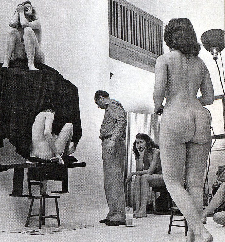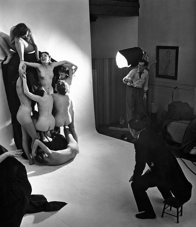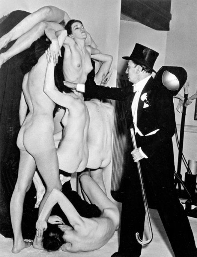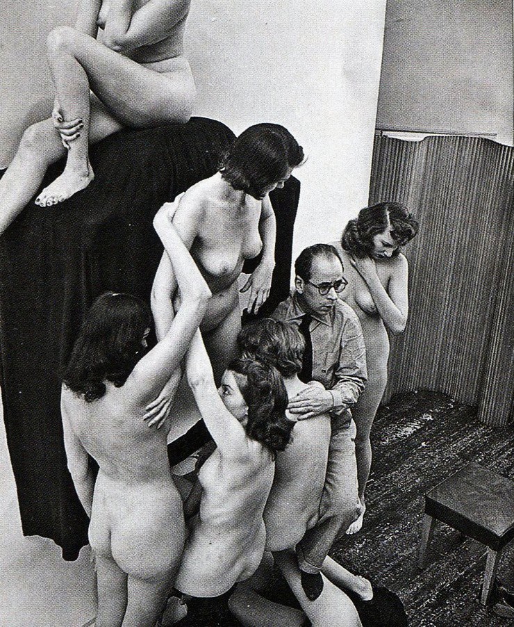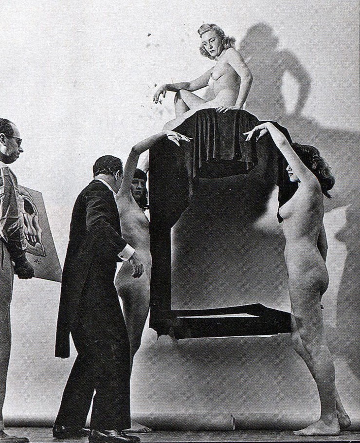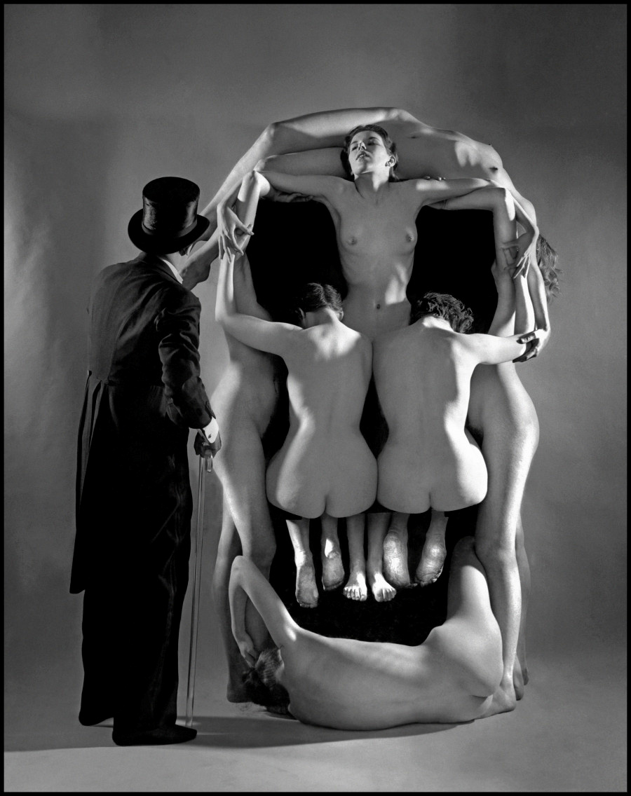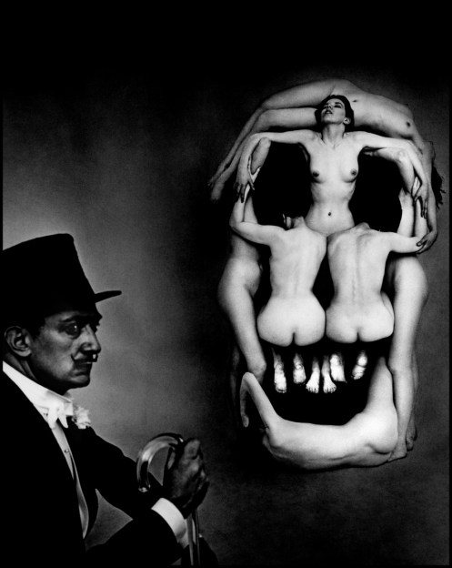 ‘In Voluptas Mors‘ (“voluptuous death”) was the title given to a photographic portrait of Spanish surrealist, Salvador Dalí posing next to a tableau vivant comprised of seven nude female models whose bodies had been organised into the form of a human skull. It was captured by Latvian-born American photographer, Philippe Halsman in 1951.