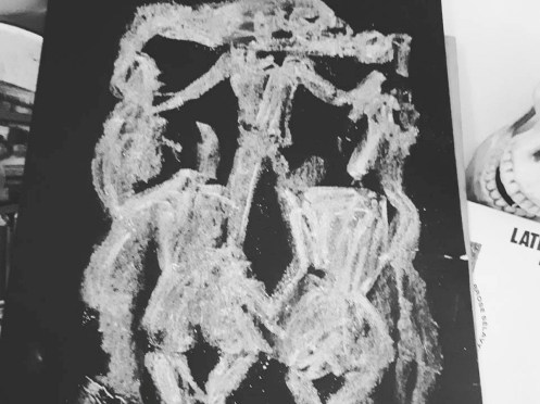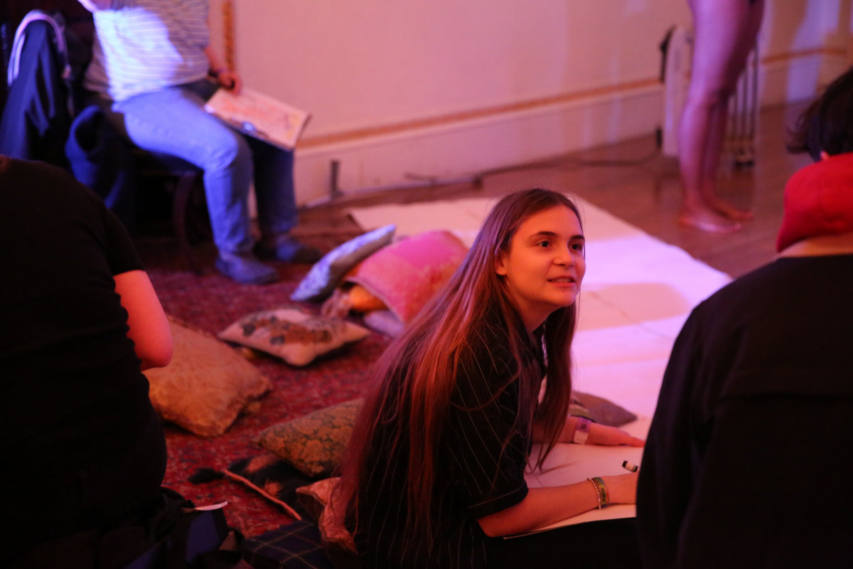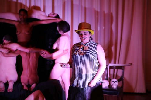 Visitors began to arrive from 7pm, settling themselves in front of our stage with papers and pens at the ready. We emerged half an hour later, disrobed and smartly organised ourselves – under Nikki’s direction – into the first skull. There would be six in total: the first was held for 10-minutes; the next five each lasted quarter of an hour.