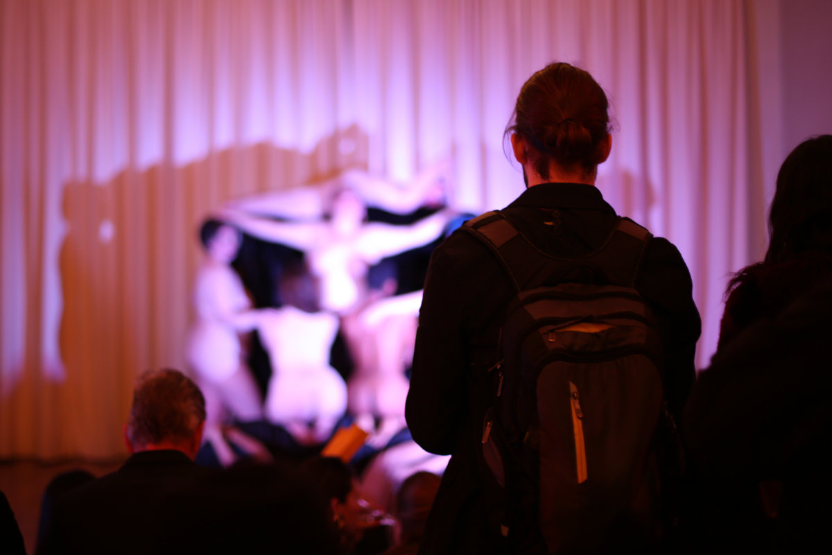 Before the doors opened to guests, we tried our installation in different configurations. Whereas Dalí and Halsman had chosen seven women of uniformly fashionable 1950s proportions, we were closer to a cross-section of 21st century London humanity in all its wonderful variety. We explored what our bodies could do and how they could align.