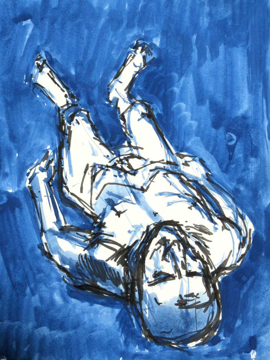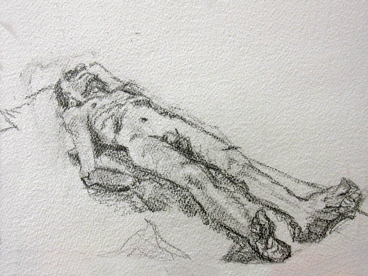Although the exercise was supposed to concern foreshortening, I sensed a few artists shuffling their easels around for less demanding side views. For me the challenge was initially how to stay awake, but after about half-an-hour I was aided by a chilly draught that circulated at floor level. Slight adjustments to heater positions during our half-time interval ensured I was snugly cocooned in warm air for the remaining 40-minutes.