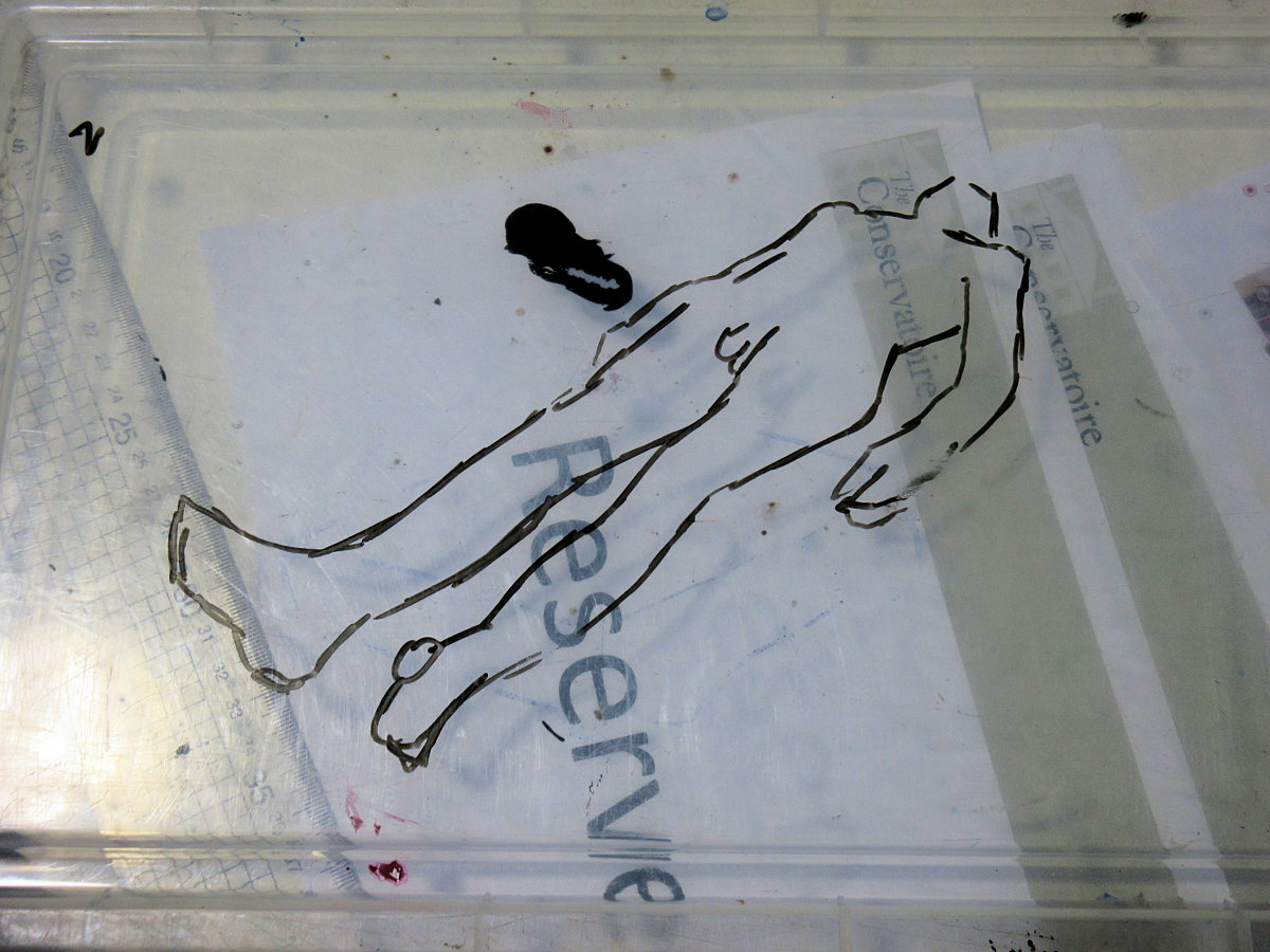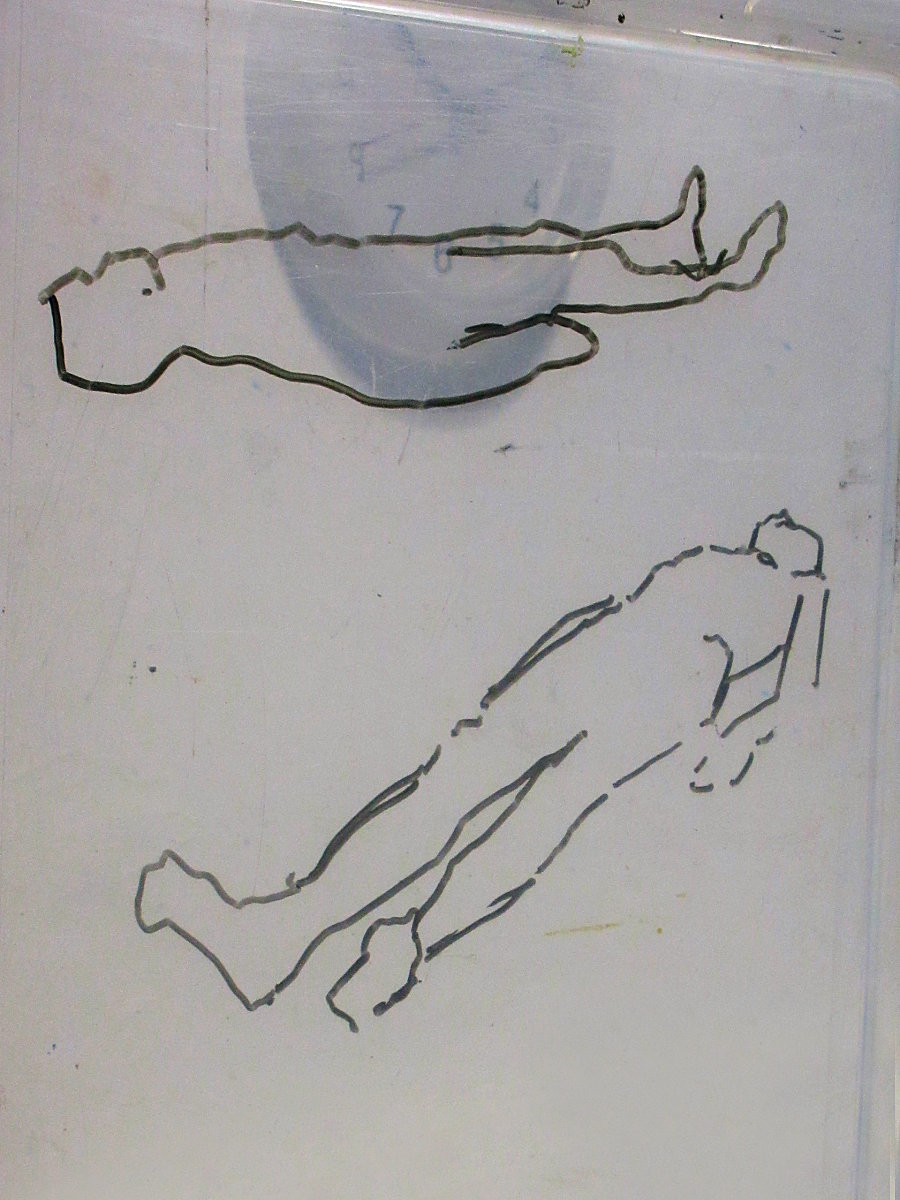 Most eye-catching amongst all the finished works were felt-pen outlines of me, drawn onto the clear plastic lids of storage boxes. Presumably these had been held at arms’ length and my body profile traced upon them. Having been surrounded by four roaring heaters throughout the session I hadn’t been able to hear whether this technique had been part of Victoria’s tuition, or was the inspired act of a desperate artist. Genius!