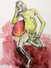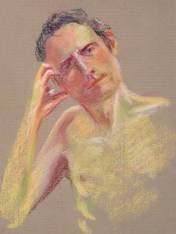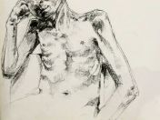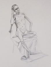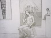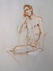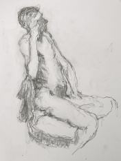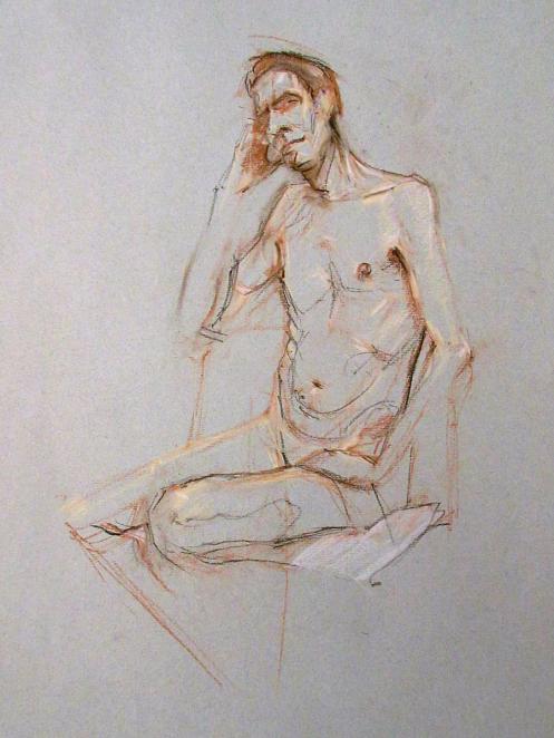Very well then. I would once more be sitting with my face and body forwards for artists arranged in a semi-circle around me. As per last time, I hooked my left ankle beneath my right buttock, but for variety put a curve in my torso and supported the right side of my face on the knuckles of my right hand. Thus we began. One pleasing aspect of the sameness was that some genuinely lovely people with superb talent would be drawing me, and I could feel assured that strong artworks would be the result of my pains.