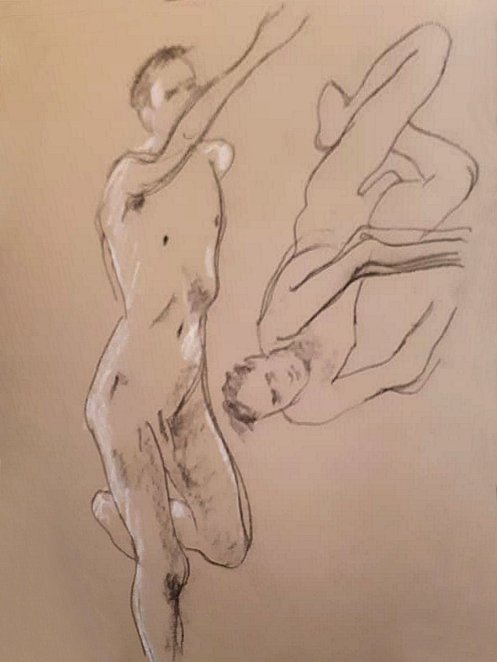 Five poses of 1-minute got us warmed-up. Amongst the plethora of pre-loved items in the cave sales room was a tailor’s dummy hanging upside down from the ceiling – for the next 5-minute pose I balanced on one leg and held its outreached hand. Perhaps redolent of The Creation of Adam on the Sistine Chapel ceiling? Not quite, but a fun connection. Another 5-minute pose, then two of 10-minutes took us to our break.