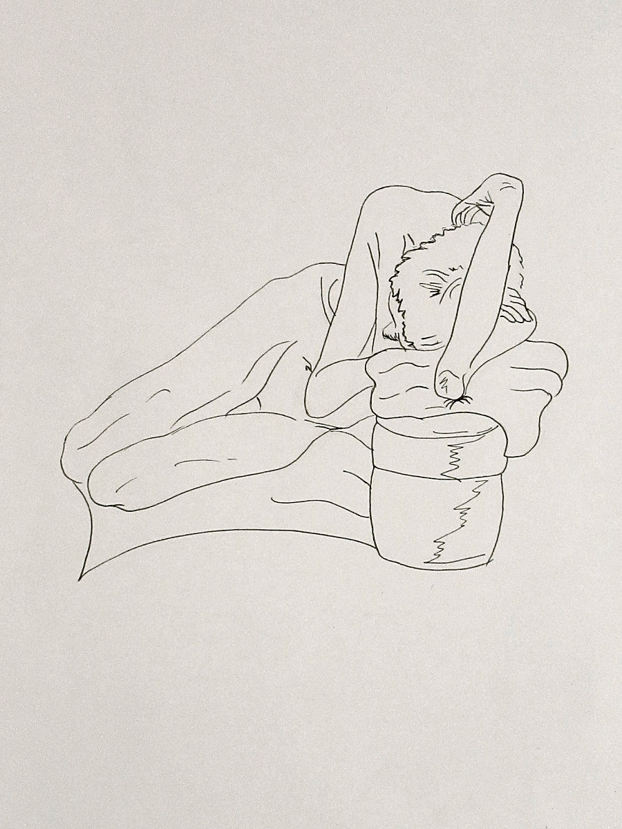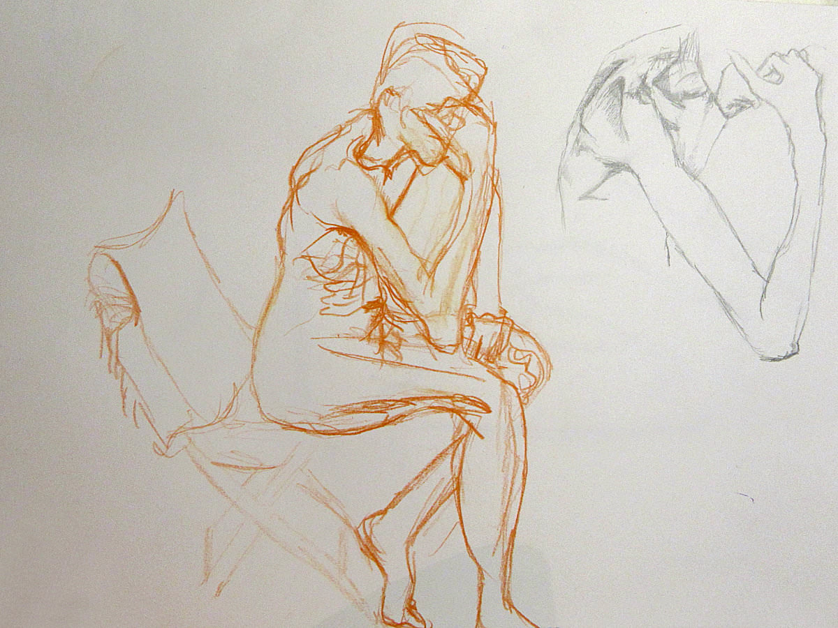 Five poses of 1-minute got us warmed-up. Amongst the plethora of pre-loved items in the cave sales room was a tailor’s dummy hanging upside down from the ceiling – for the next 5-minute pose I balanced on one leg and held its outreached hand. Perhaps redolent of The Creation of Adam on the Sistine Chapel ceiling? Not quite, but a fun connection. Another 5-minute pose, then two of 10-minutes took us to our break.
