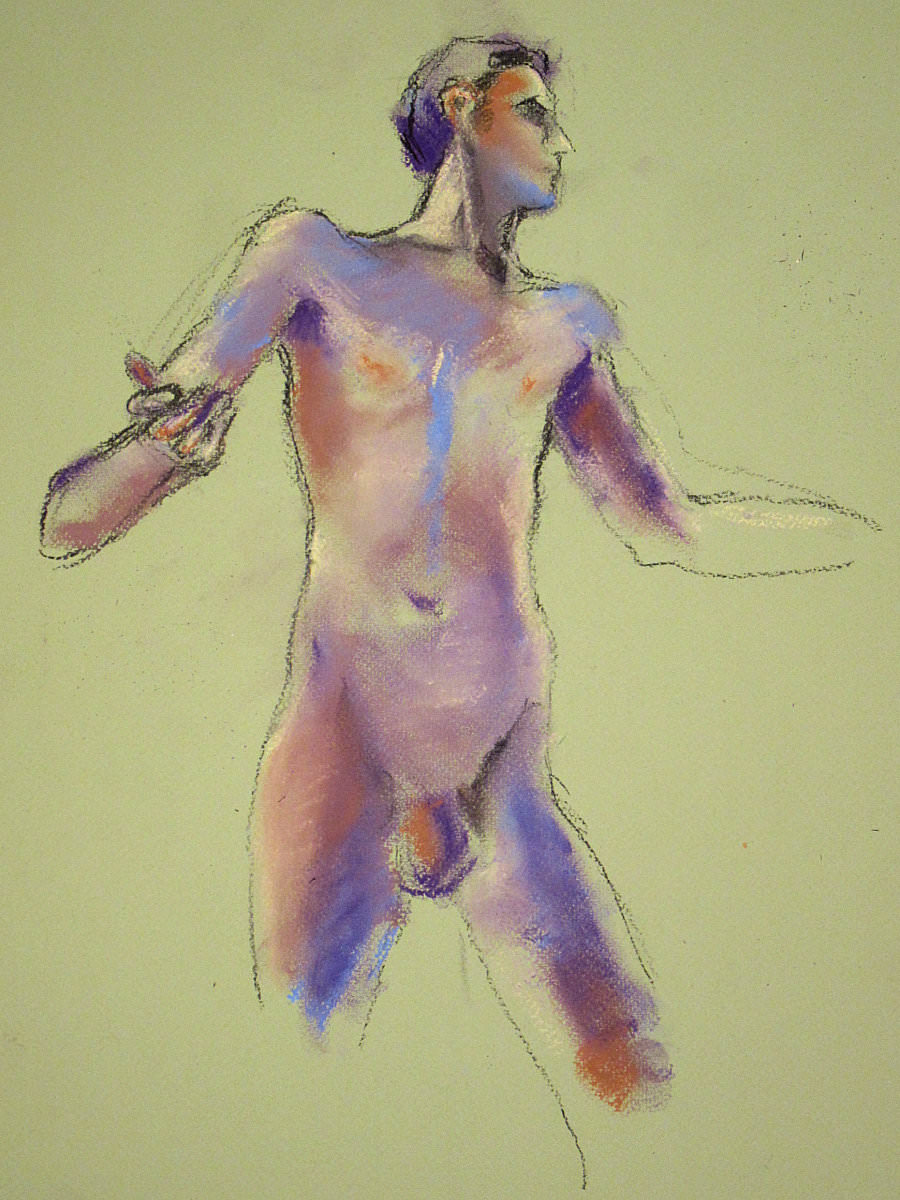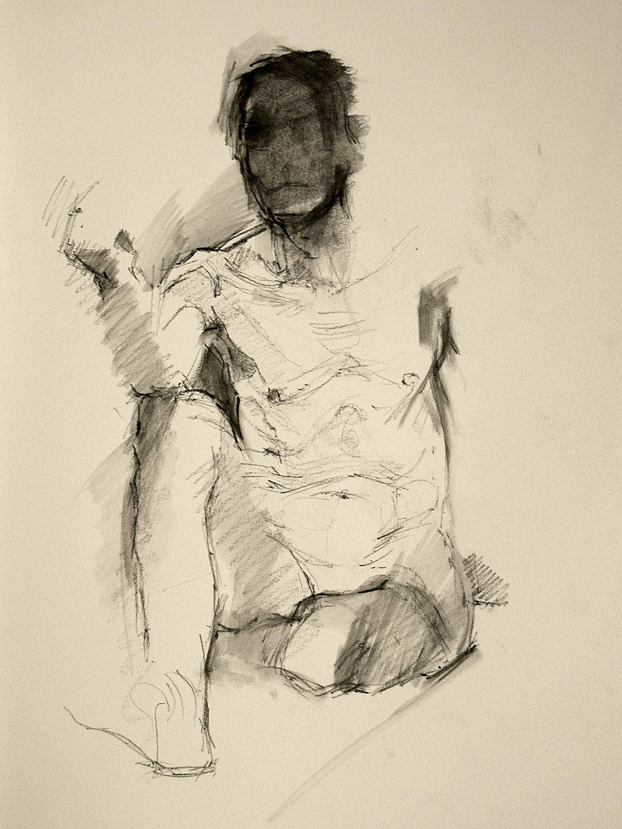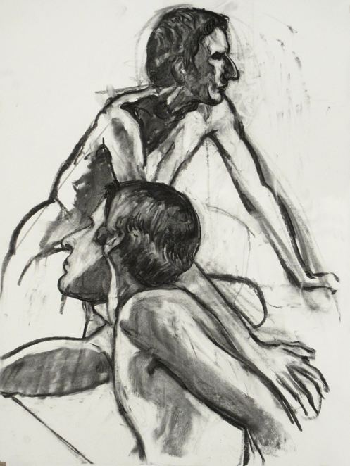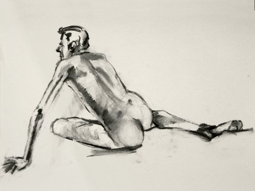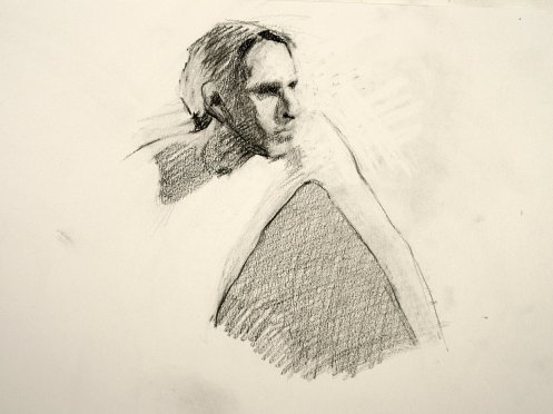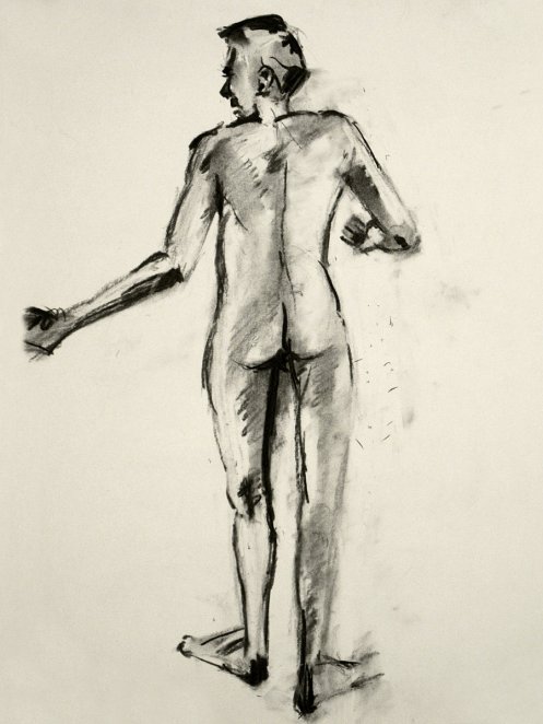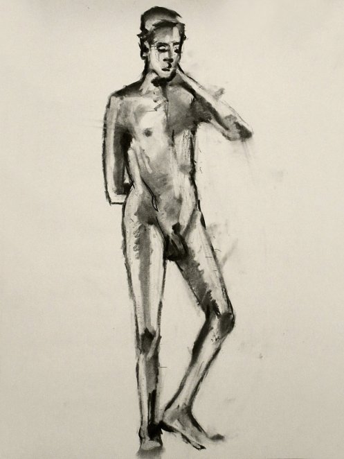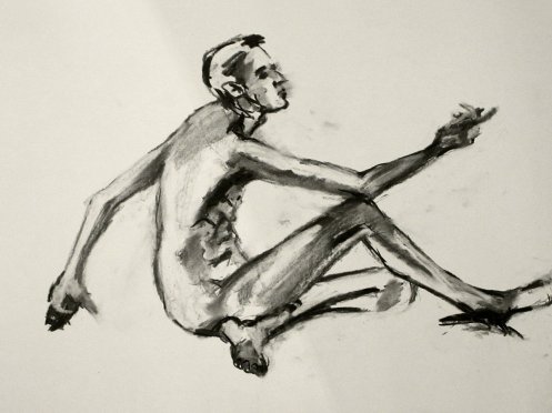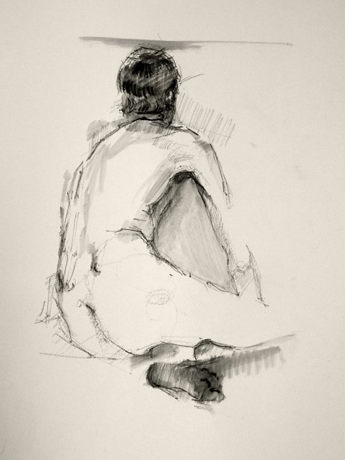 The four models working for Hesketh Hubbard Art Society this evening were: Esther on 15-minute poses, me on 30-minute poses, Tiziana on the long pose, and Valentina sitting for portraits. I arrived at Mall Galleries almost half an hour early yet there were scores of artists already present; circling Esther’s area in greatest numbers, but I had a good crowd of familiar faces too. My opening posture was upright.