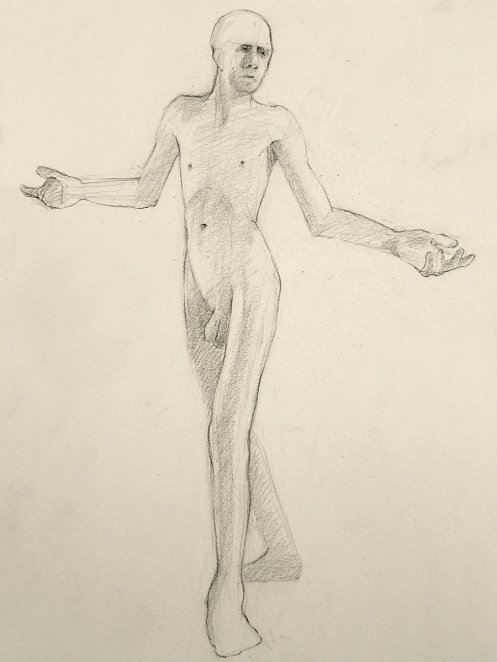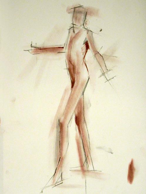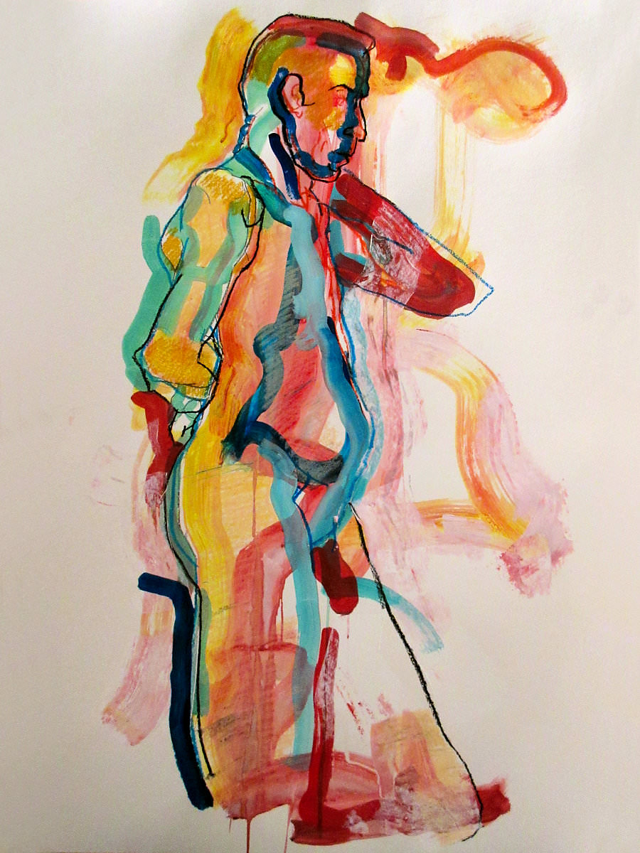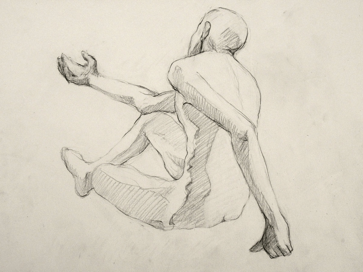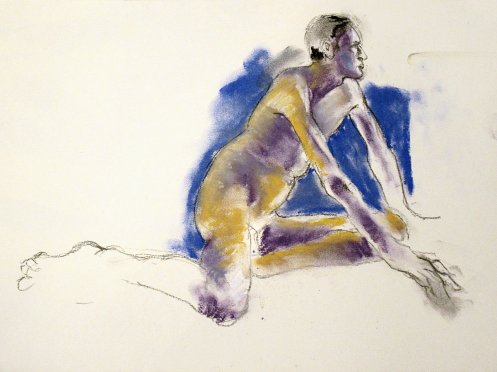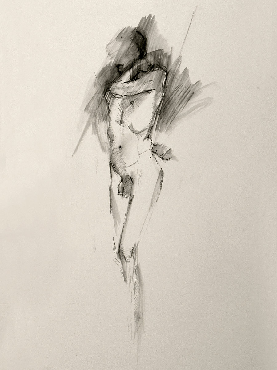 The four models working for Hesketh Hubbard Art Society this evening were: Esther on 15-minute poses, me on 30-minute poses, Tiziana on the long pose, and Valentina sitting for portraits. I arrived at Mall Galleries almost half an hour early yet there were scores of artists already present; circling Esther’s area in greatest numbers, but I had a good crowd of familiar faces too. My opening posture was upright.