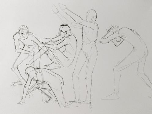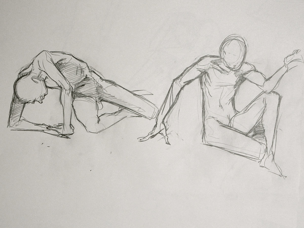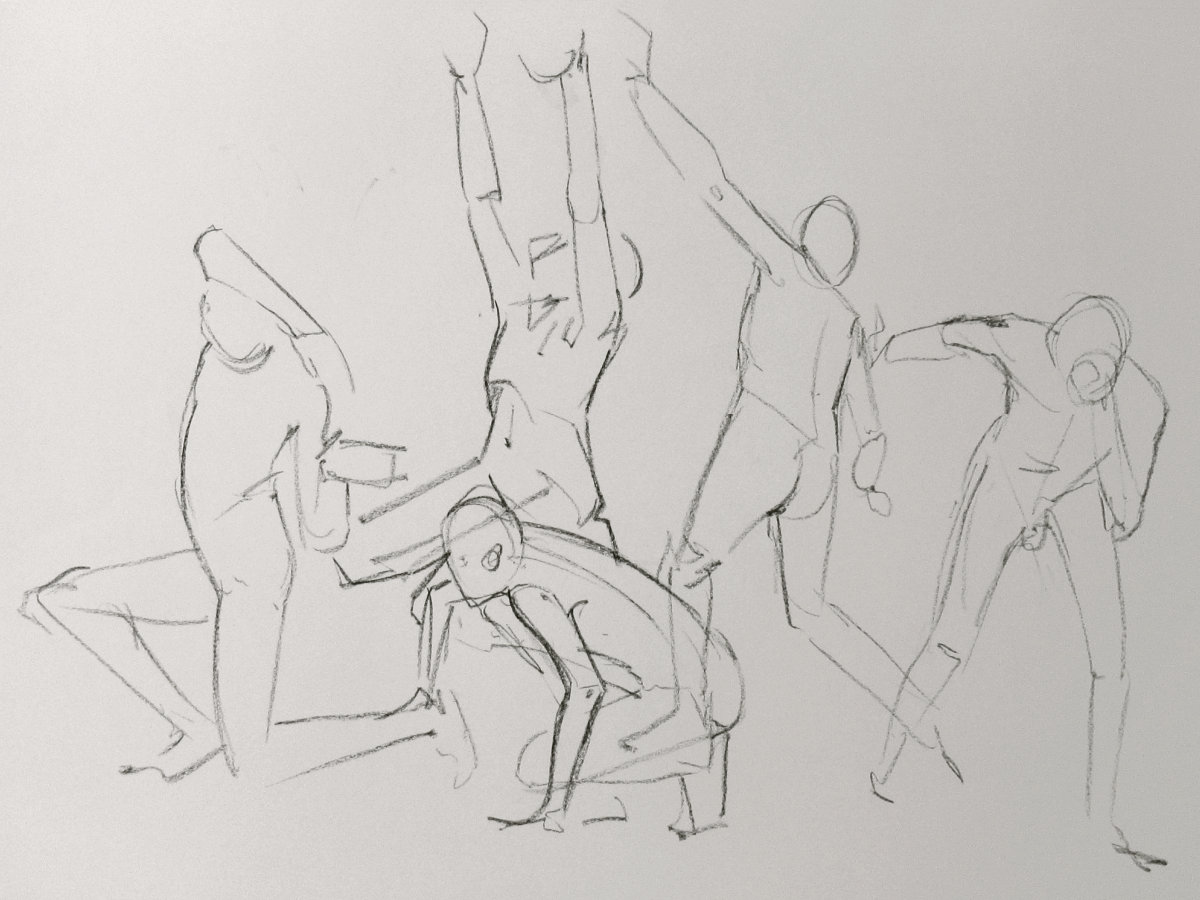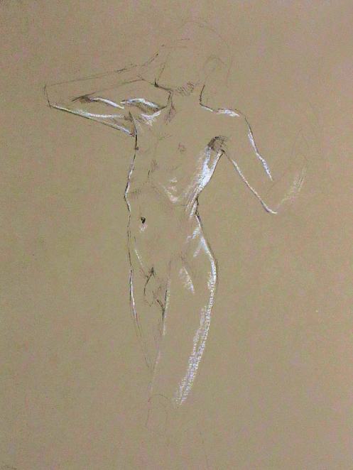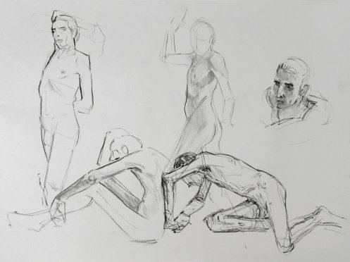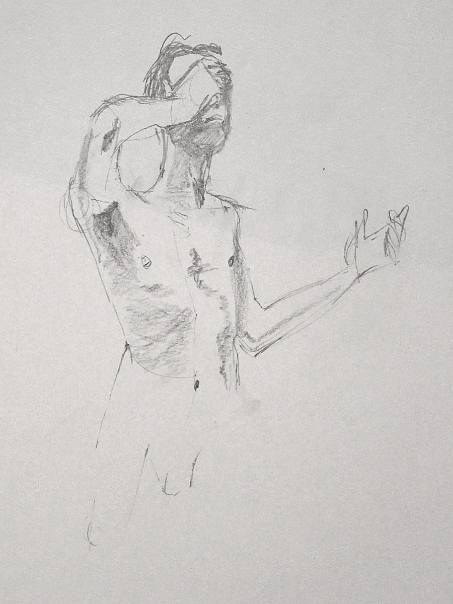 It’s fortunate that the opportunity to create many quick poses is always quite inspiring for me as the pose space itself offered little sensory stimulation. The large silent room was without any source of natural light; there was no music, no chatter, no countdown of time, no temperature fluctuations or uneven flooring, just a phone beep that signified when it was time to change pose, plus the diligent scratchings of half a dozen artists.