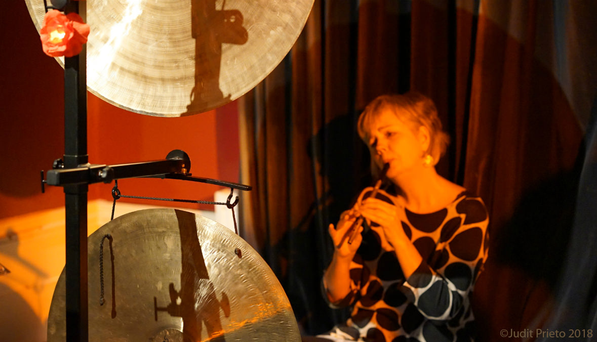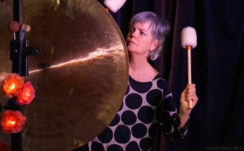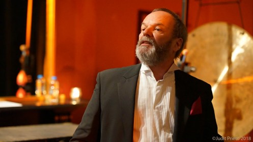 Thirty chairs were set in a quarter circle of radiating ranks that faced one corner of the room. Their eyeless attention was directed towards a vintage suitcase that lay across two small square tables pressed against a cold fireplace. A brace of large gongs were hanging adjacent, surrounded by an array of bowls, pipes and percussion instruments; the tools of a soundbath maestro. We had lights, we had cameras, and it was time for a little action. It was time for…