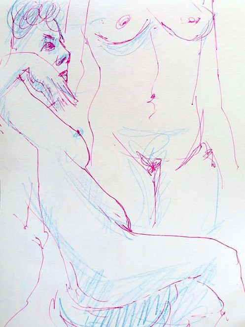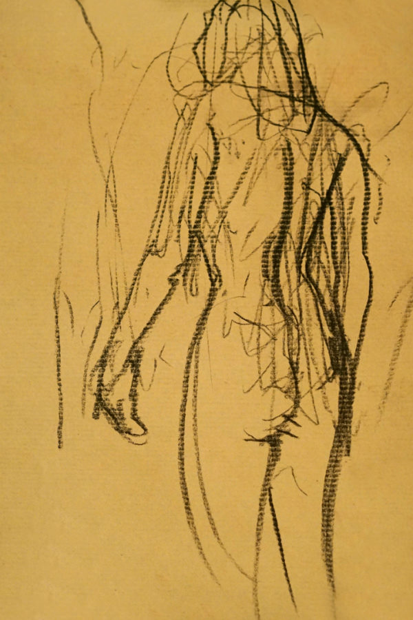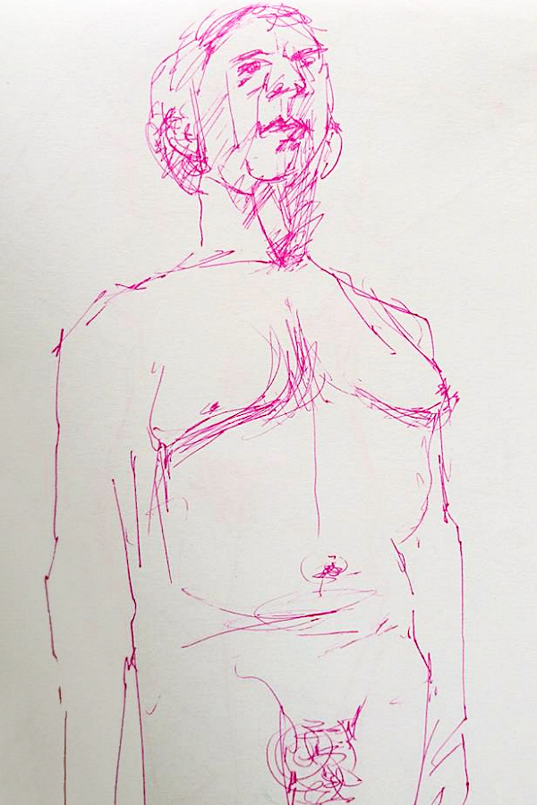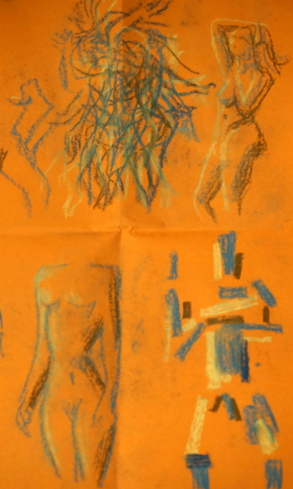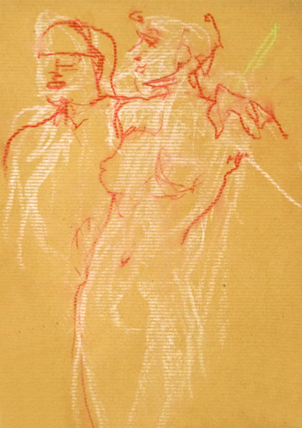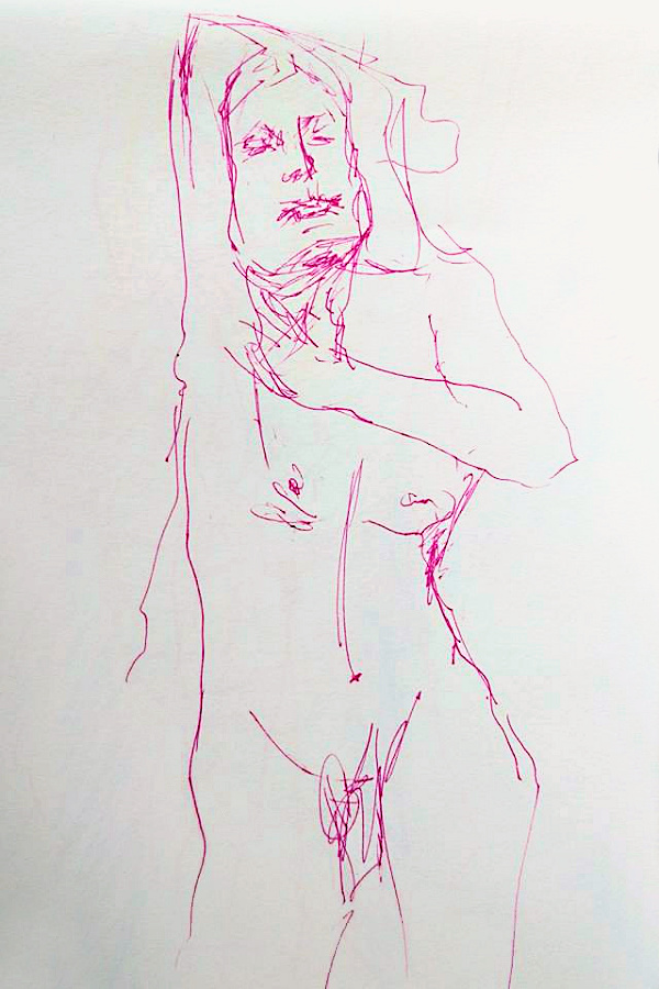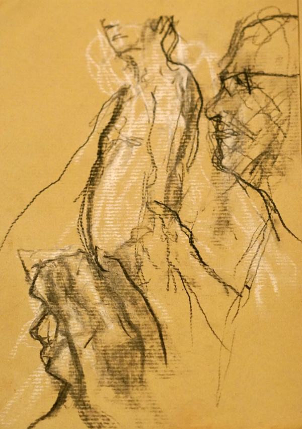Nude standing poses, movement to the sounds of a gong bath, shawls and a pink hat for nostalgia… whilst a captivated audience sat sketching, or simply entranced. In the midst of it all, an invitation was extended for one of them to try modelling. Hands were raised and one volunteer selected; he undressed and stood bare for 5-minutes. Before the first half ended, a second volunteer was summoned and he too posed naked while wave after wave of gong shimmers engulfed us. Both first-timers, they did very well.