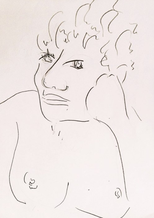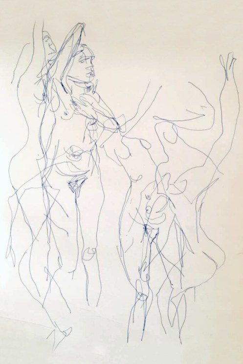 The words “Testimony… Sacrifice… Rebirth” on the event’s advertising, along with the presence of Lady and Lord Summerisle, may have suggested a probable denouement to fans of legendary 1973 movie, ‘The Wicker Man‘. We would build a wicker person! Out of naked bodies! More volunteers – good friends, all – emerged from the audience and were assembled into tableaux that could be held for 5 or 10-minutes. Artists drew each wondrous construction whilst Esther and Sarah made music.