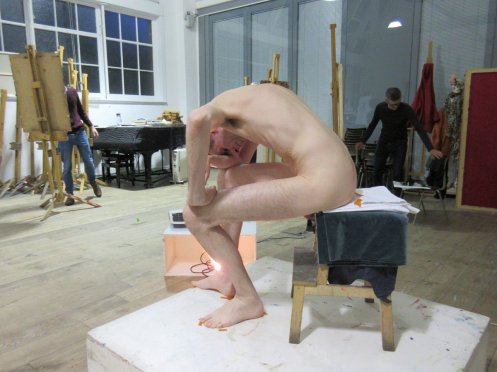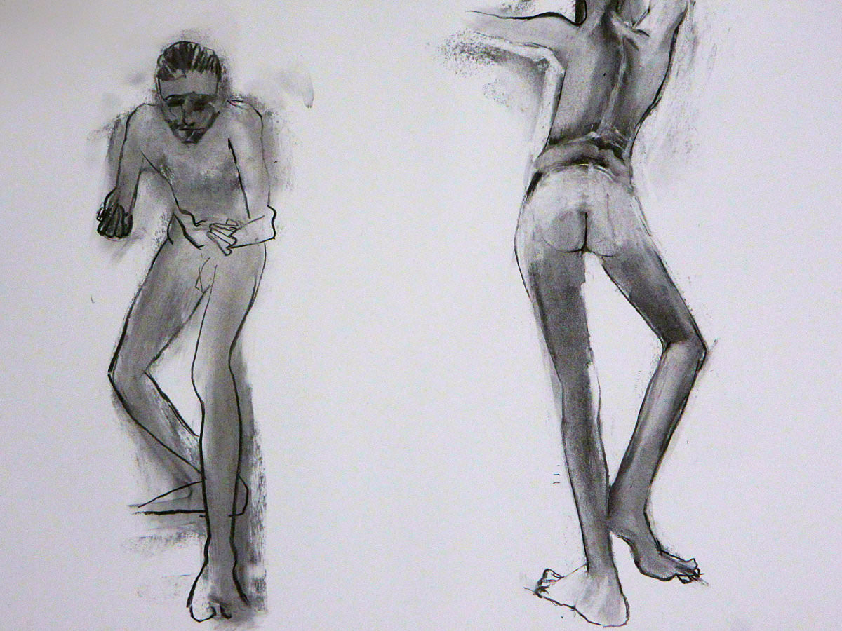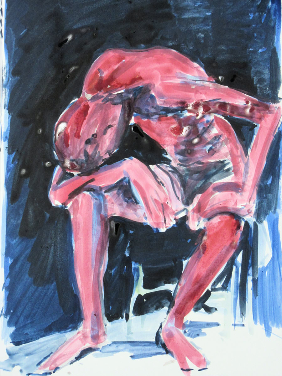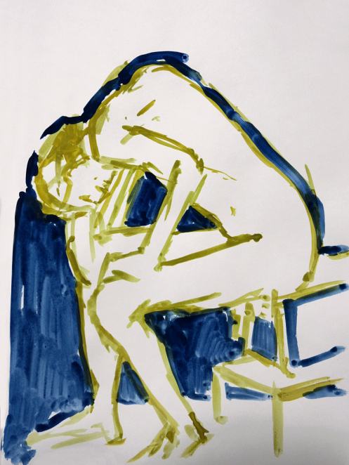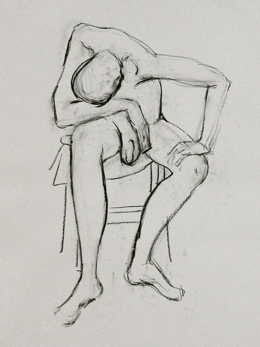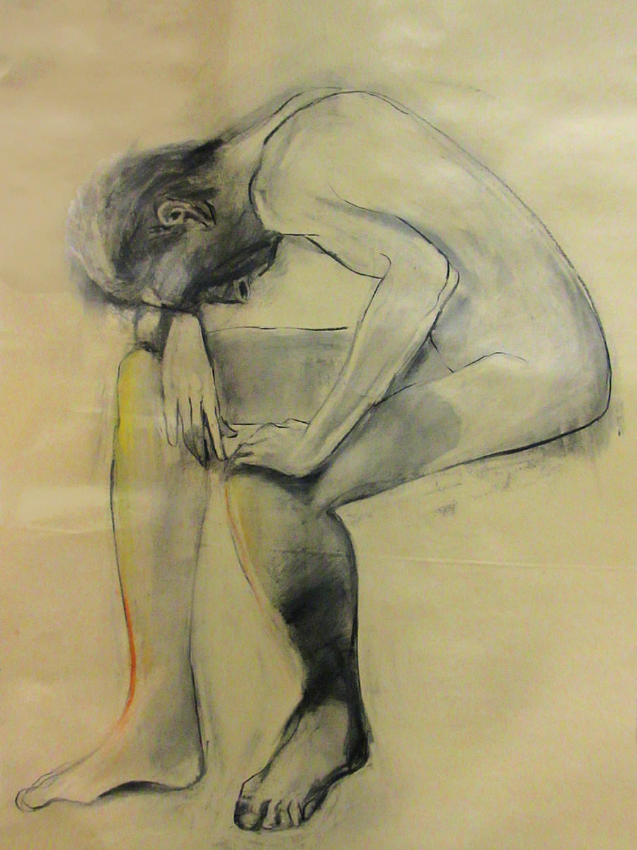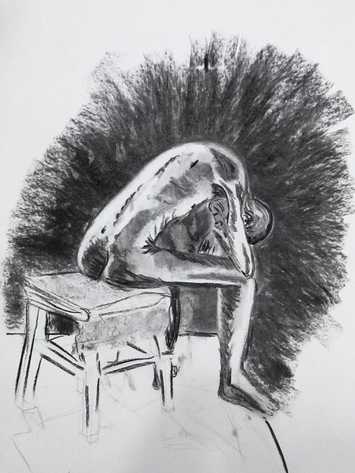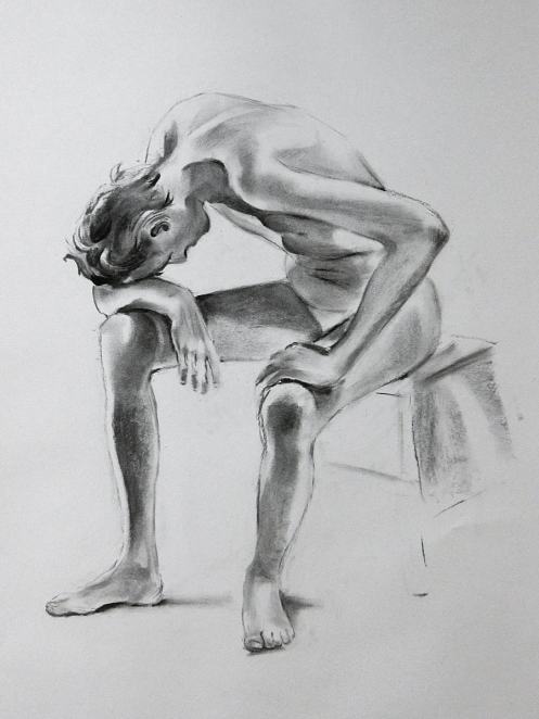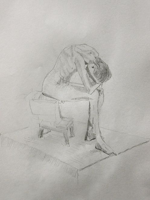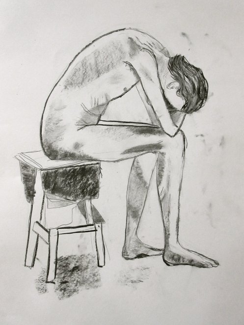 Before we started, while artists were still arriving, Victoria demonstrated the long pose she wanted me to attempt: sitting down, leaning forward, with one forearm across one leg and my forehead resting upon the arm. Appropriately, it was to represent ‘despair‘. Cometh the hour, I sat on wooden steps and fidgeted to find a sustainable attitude yet couldn’t quite make it satisfactory. Time was pressing, however, so I settled in haste.