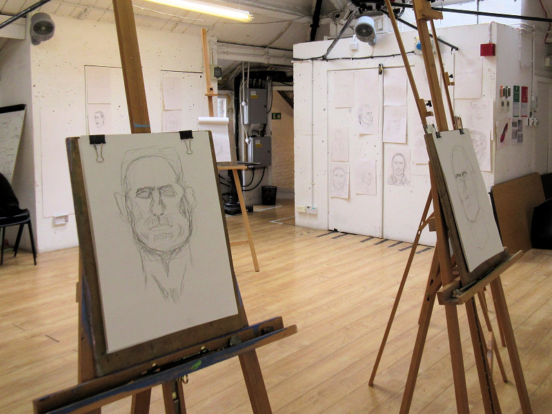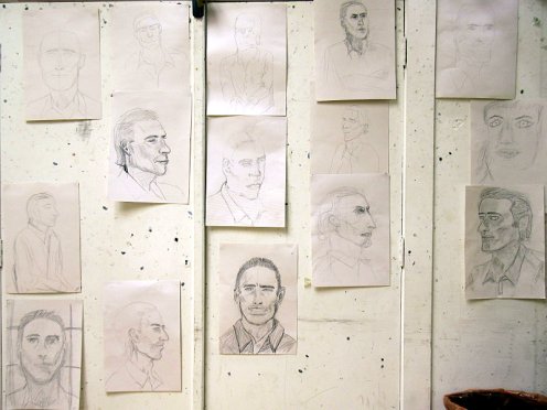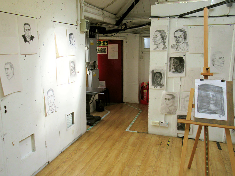 On Sunday I spent five hours sitting motionless in front of eight artists with easels for a City Academy portrait drawing session at Arts Theatre. Two and half hours in the morning, an hour’s break for lunch, then a further two and half hours for the afternoon. The session opened with four 5-minute warm-ups: first drawing me without looking at the paper, next drawing me but only glancing at the paper to position the pencil, then drawing me upside down, and finally drawing each other.