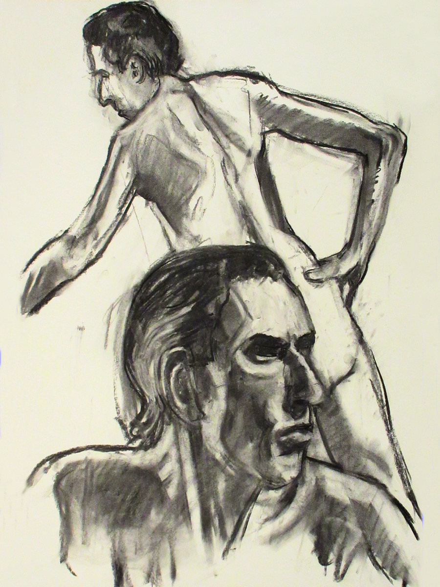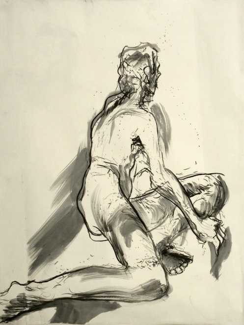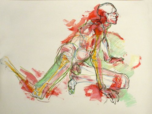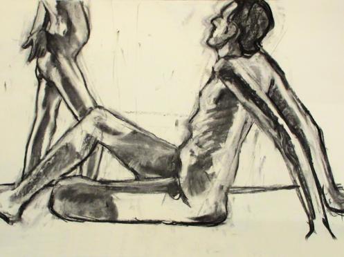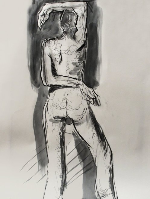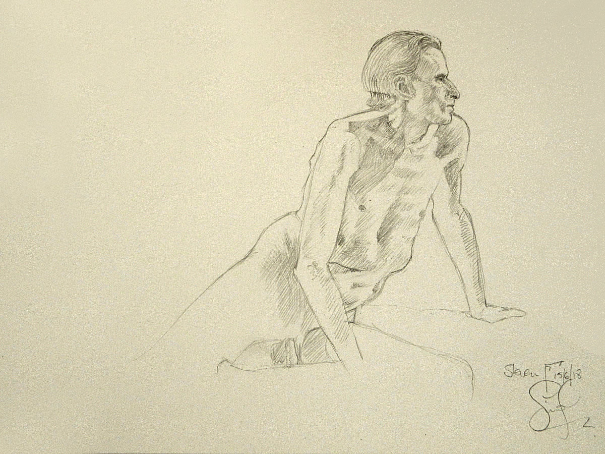 I think slightly fewer Hesketh Hubbard Art Society artists were with me compared to the three female models on 15-minutes, long and portrait poses, but that never makes me envious, just more determined to do well for those who’ve opted to draw me. First I stood reaching out in a stride, then sat leaning forward with legs extended.