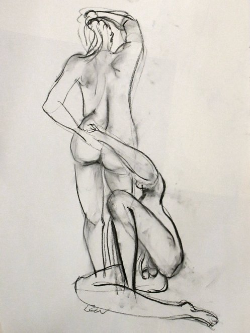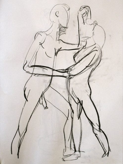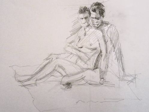 We hadn’t reckoned on being quite so out of practice. Last year, Esther and I had duo posed for life drawing groups on seventeen separate occasions. In the first six months of 2018 it had been just twice, the most recent being way back in February. It’s easy to forget the extra concentration needed to make a well-balanced sustainable pose for two people – especially when both are so eager to take position.