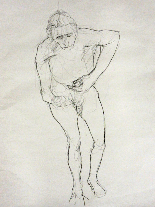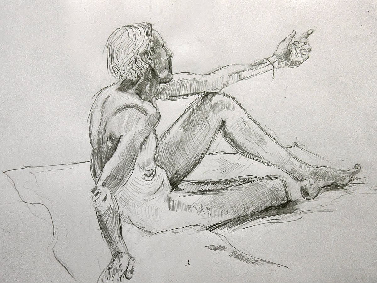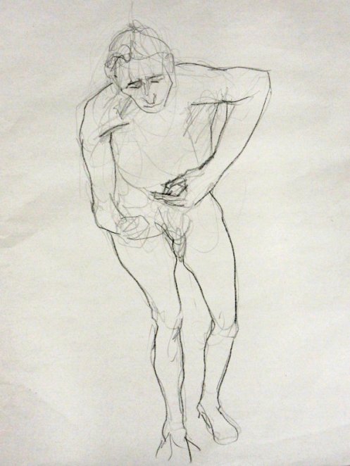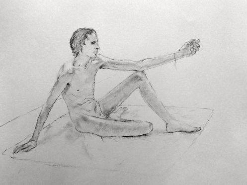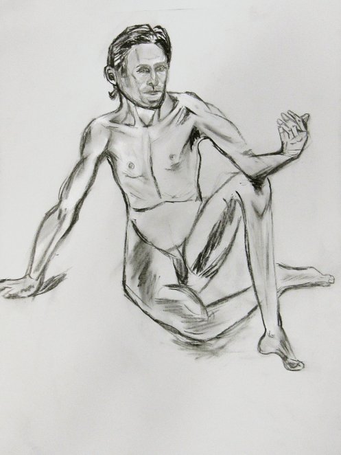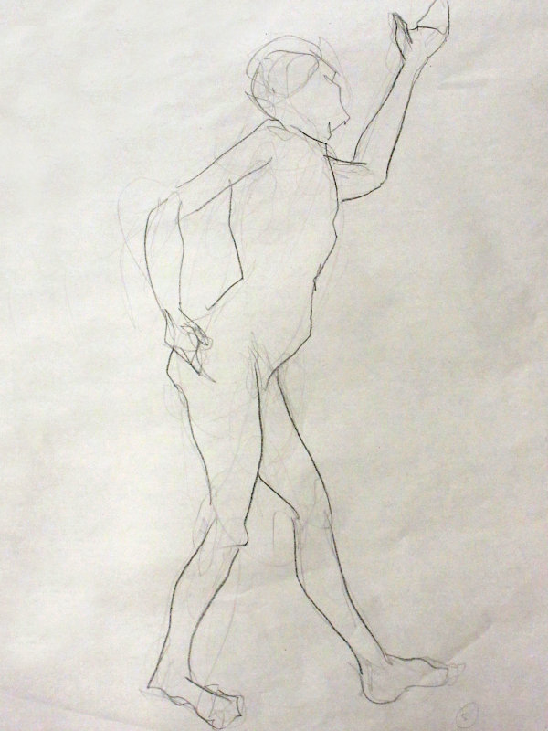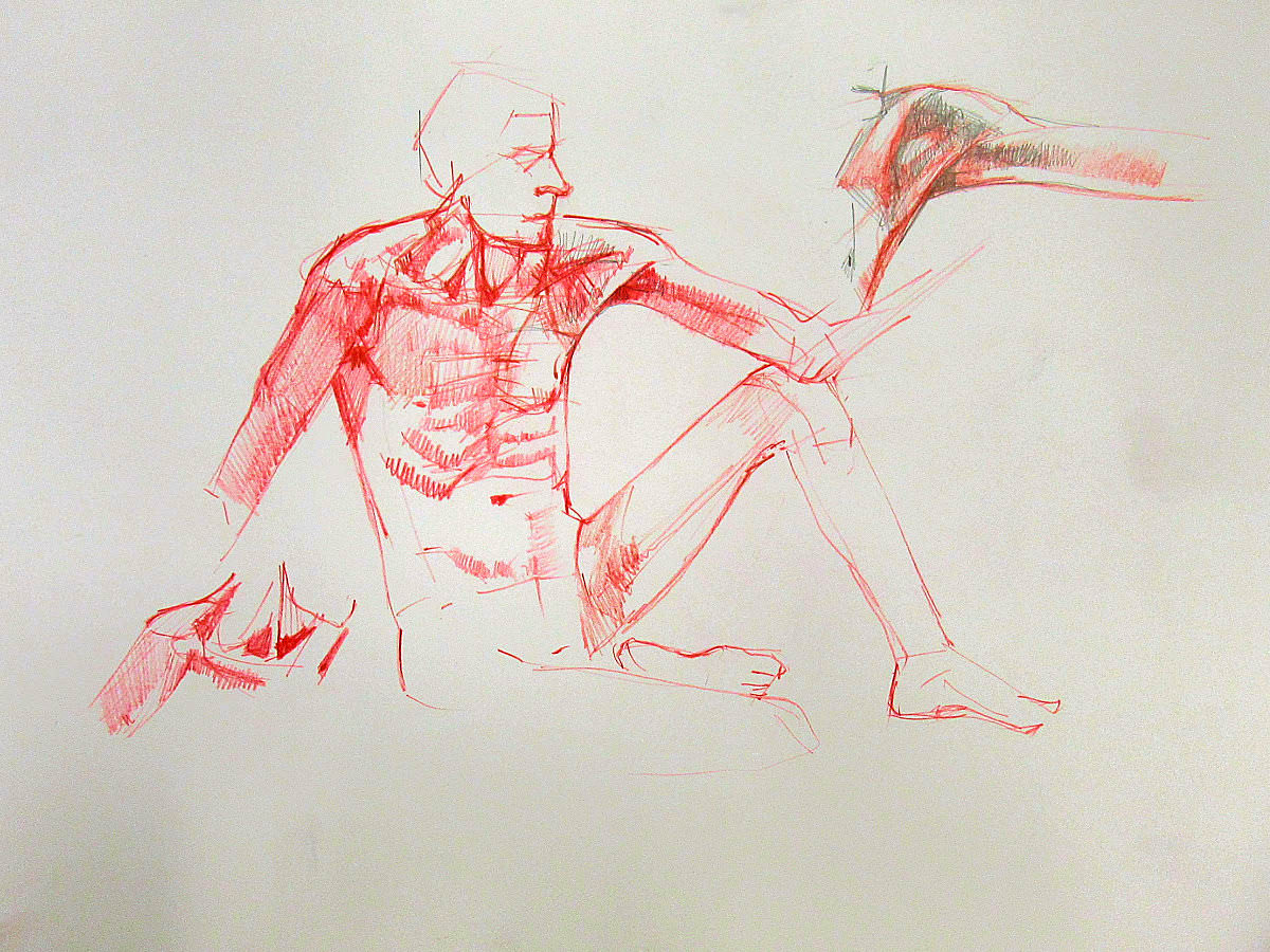 Sunny it may have been, but we would be working in one of the basement community rooms. Familiar faces were on the scene as I arrived and took position in a horseshoe of chairs. This was a long-pose session but we started with three 5-minute warm-ups.