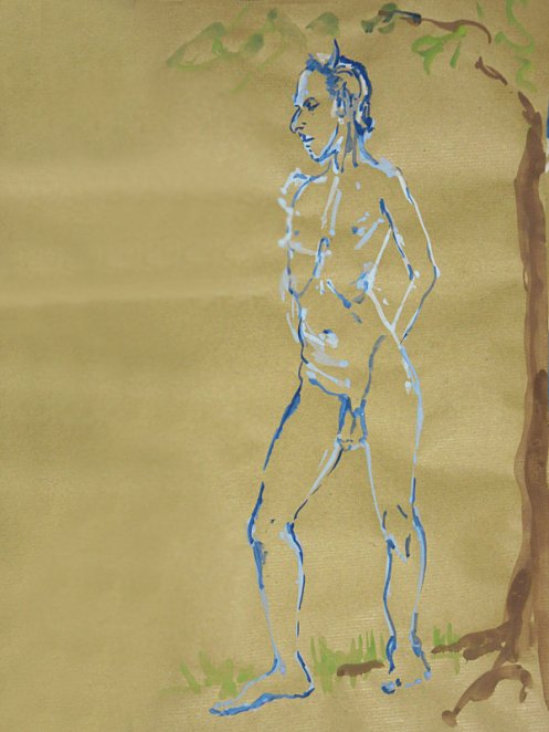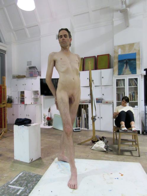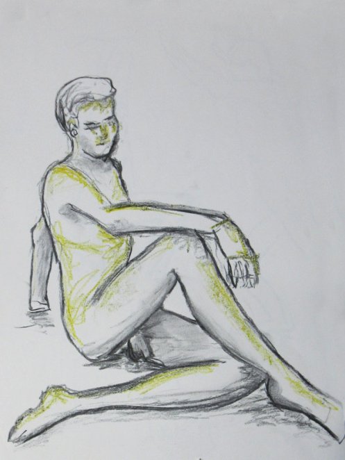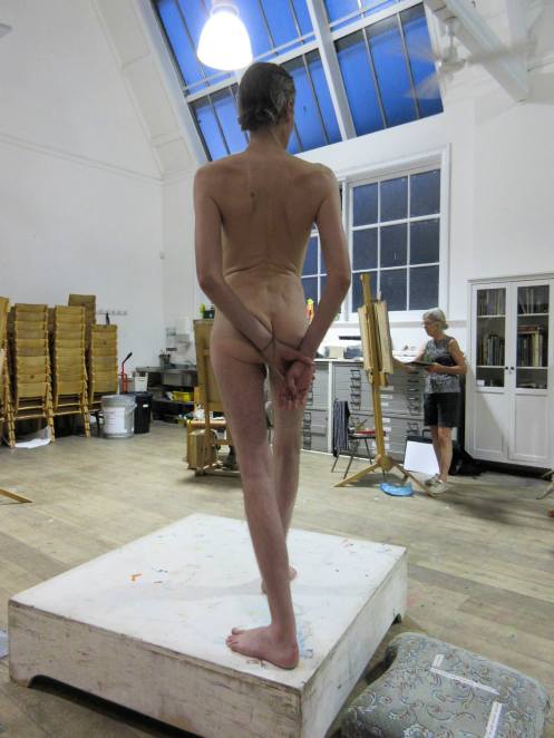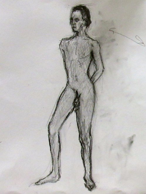 Victoria gave me the honour of selecting the long pose. Having learned that this would be the last Monday life drawing of term, I asked whether at any previous session there had been an opportunity for the class to draw a standing model as the long pose? The answer was ‘no’ so, feeling kind hearted, I adopted a suitably dramatic upright stance.