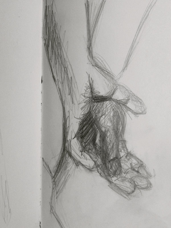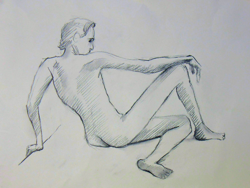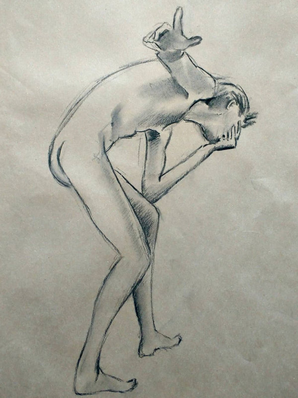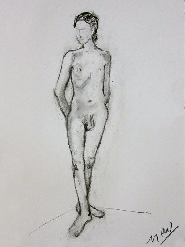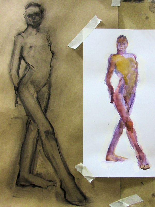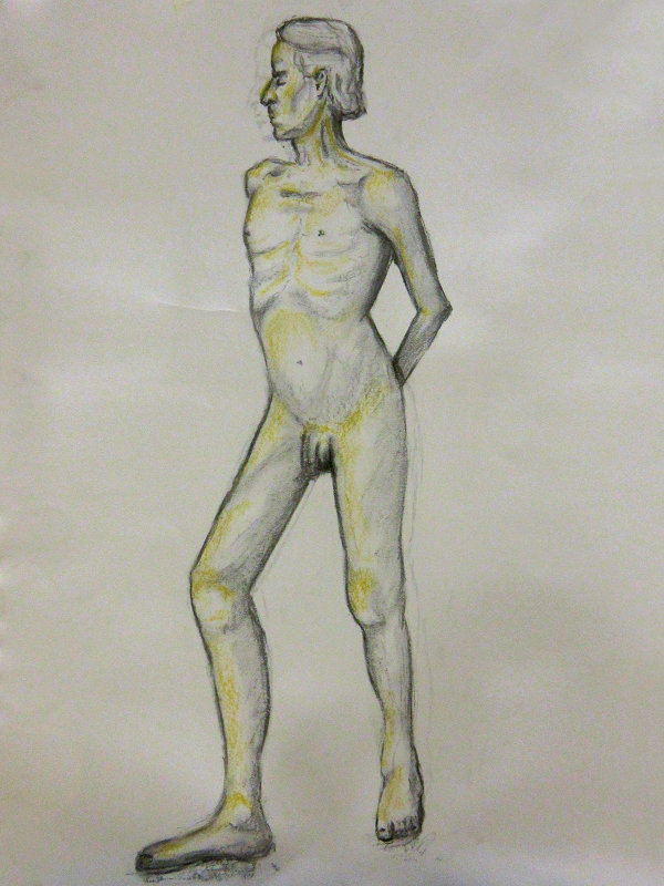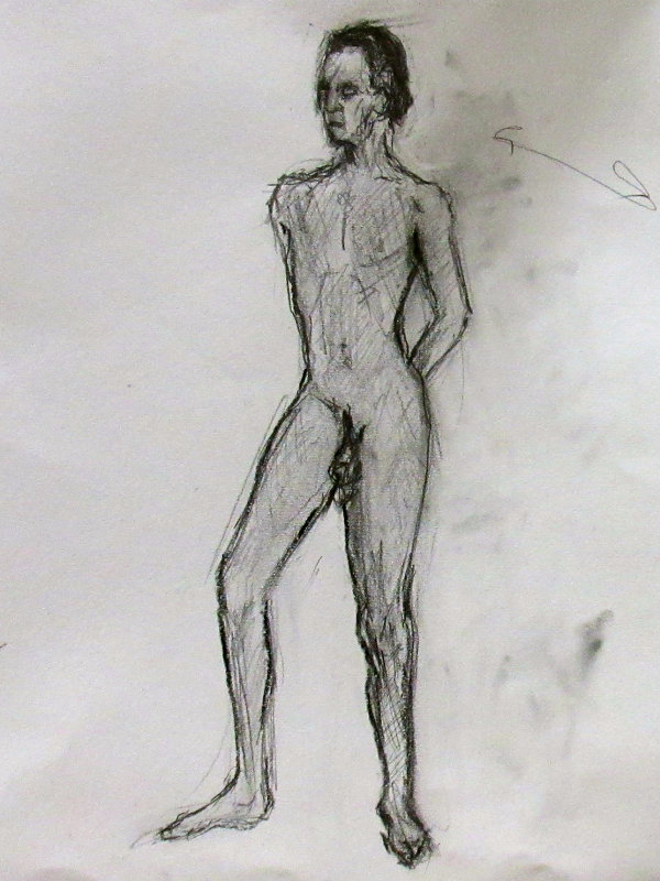 Victoria gave me the honour of selecting the long pose. Having learned that this would be the last Monday life drawing of term, I asked whether at any previous session there had been an opportunity for the class to draw a standing model as the long pose? The answer was ‘no’ so, feeling kind hearted, I adopted a suitably dramatic upright stance.
