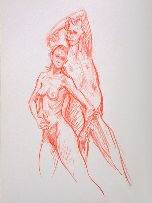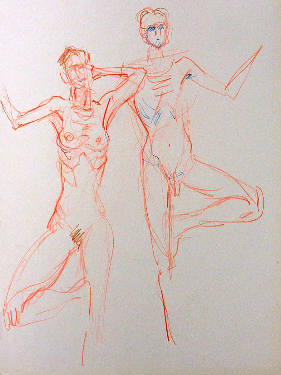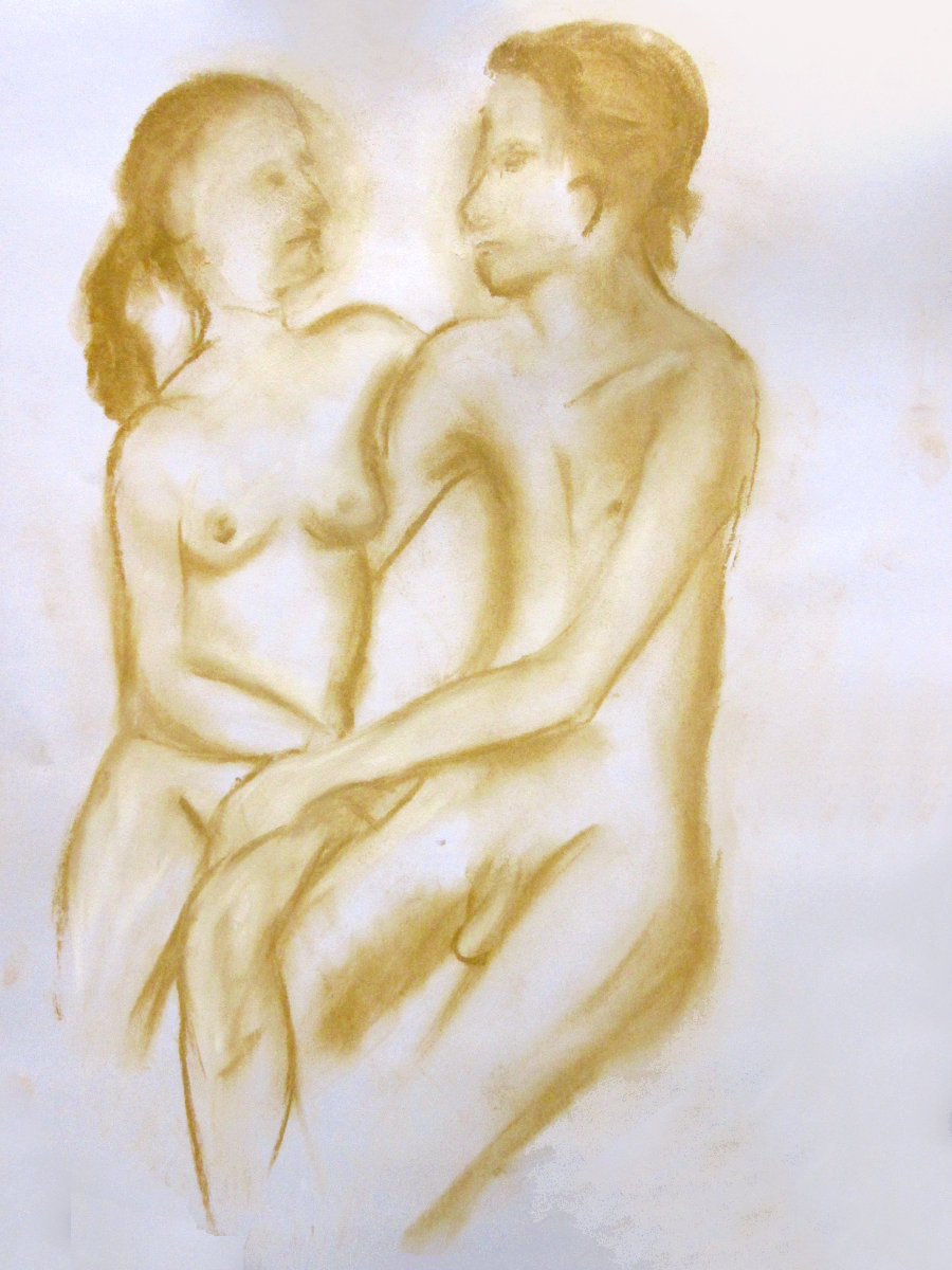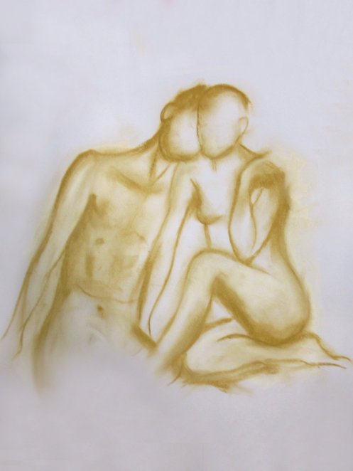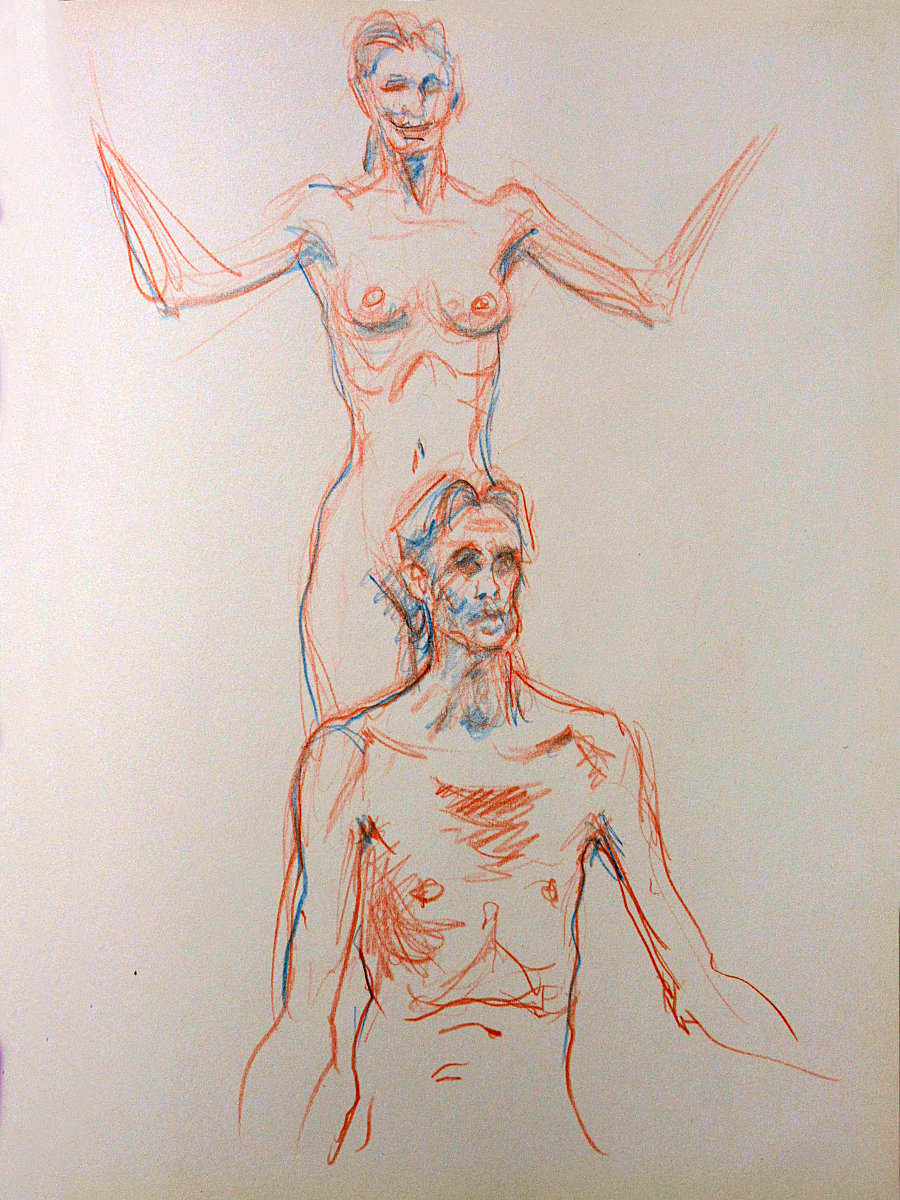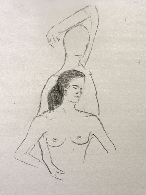 When Esther and I returned to Fairkytes Arts Centre for our third time modelling as a couple there, we brought some freshly rehearsed poses and a shift from serving solely as passive templates for artistic interpretation. We would open up to the semi-circle of artists in front of us while we posed – to begin with, for 5, 10, 15 and 15-minutes.