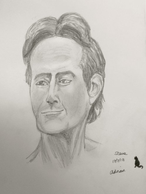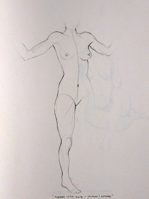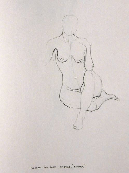 For the opening 5-minute pose, we each balanced on one leg whilst Esther described the sequence of events that led her to become a life model. Next Esther stood behind me while I sat cross-legged upon the floor for 10-minutes and told my own story. With twice as long in which to do so, I… spoke… a… little… slower.