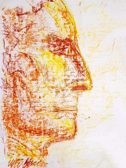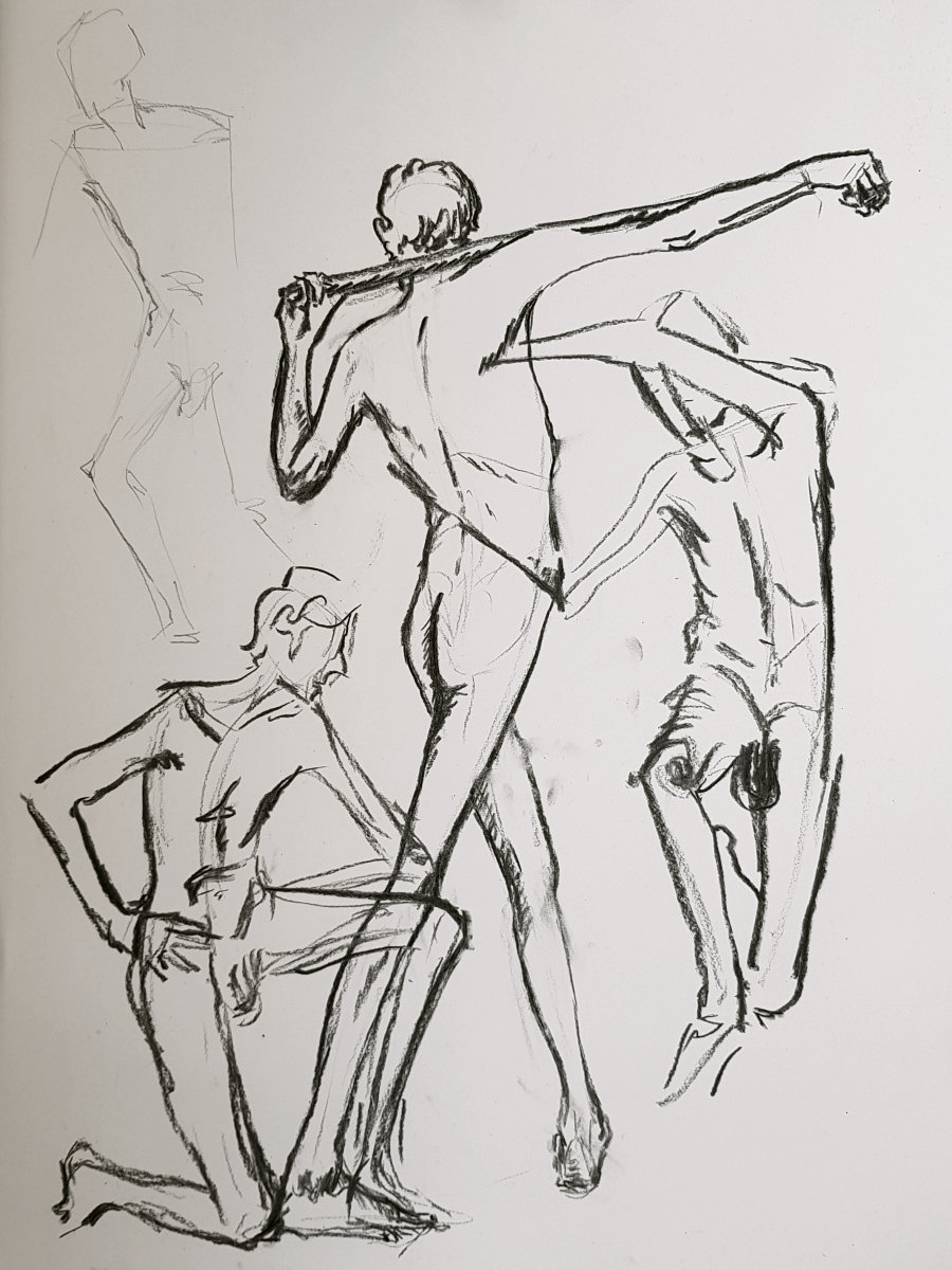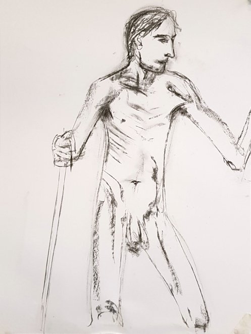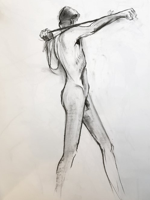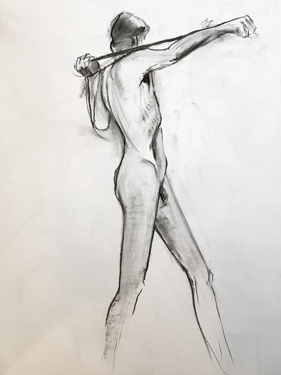 With warm sunshine streaming in through The Dellow Centre windows, I took off my robe, entered the round of artists, grasped a wooden stick across both shoulders, and commenced the opening 15-minute standing pose. It is a pose I enjoy and a good one to hold whilst artists are still arriving. We followed it with no fewer than 10 quick poses that began 3-minutes, 2-minutes, 1-minute, decreasing in length down to 7-seconds.
