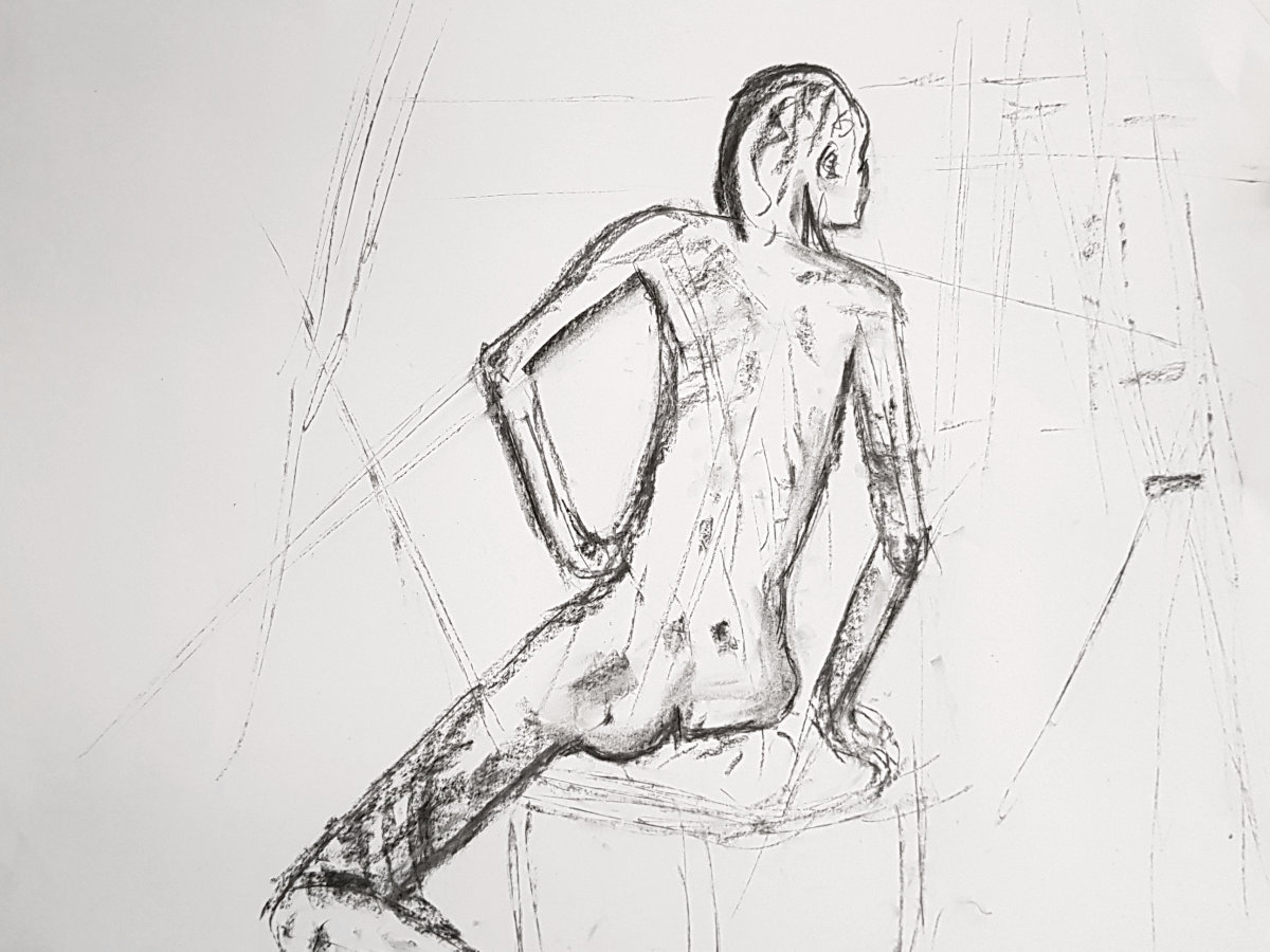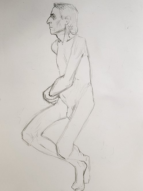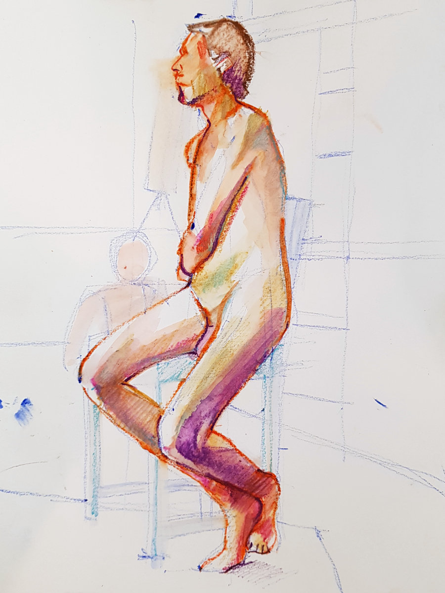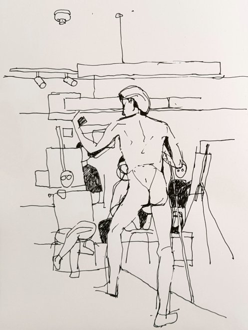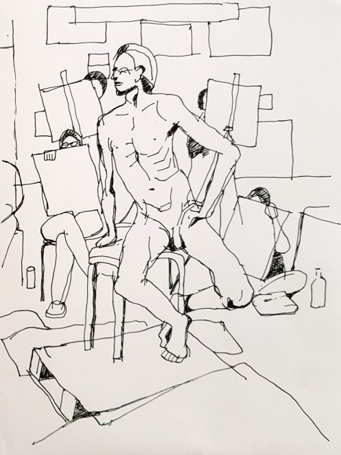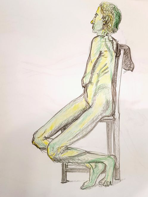 The session concluded with a 40-minute long seated pose, side-saddle on a wooden chair, twisting my torso round to the right. A 40-minute body twist is usually good for an ache or two but with a folded sheet under my backside and a cushion beneath an arm that I’d hooked over the chair’s back, I felt comfortable. Lovely feedback from the artists rounded off a nice afternoon.