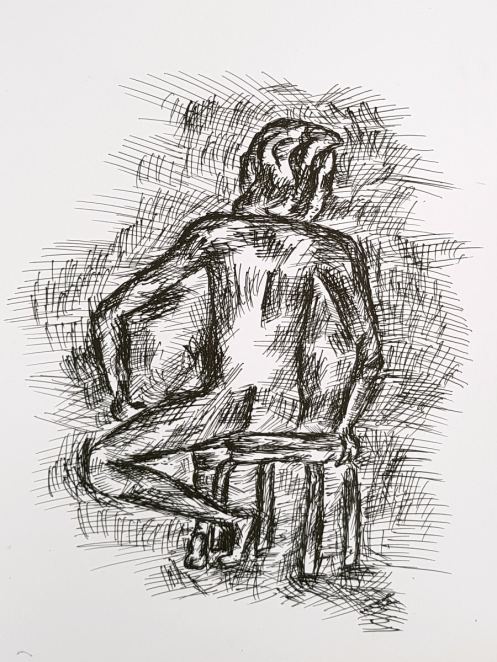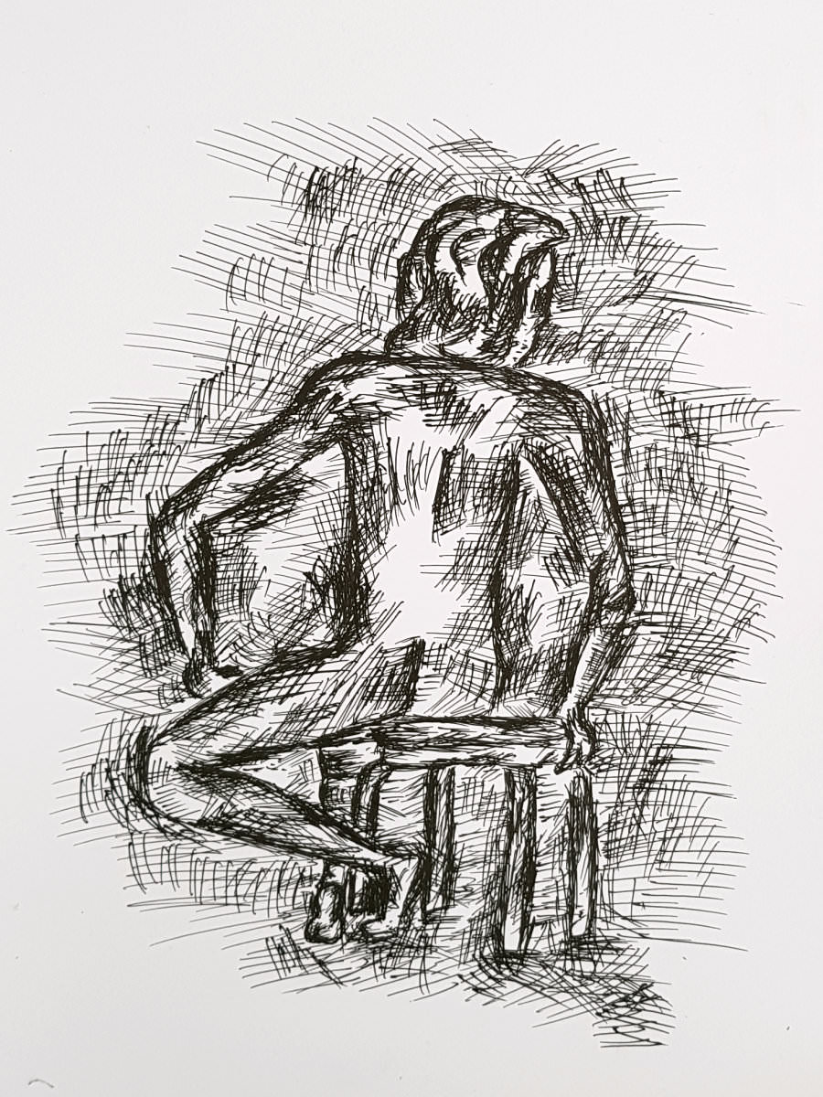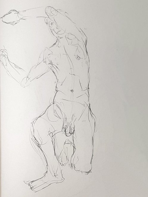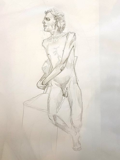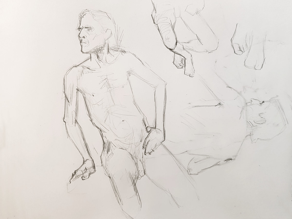The session concluded with a 40-minute long seated pose, side-saddle on a wooden chair, twisting my torso round to the right. A 40-minute body twist is usually good for an ache or two but with a folded sheet under my backside and a cushion beneath an arm that I’d hooked over the chair’s back, I felt comfortable. Lovely feedback from the artists rounded off a nice afternoon.