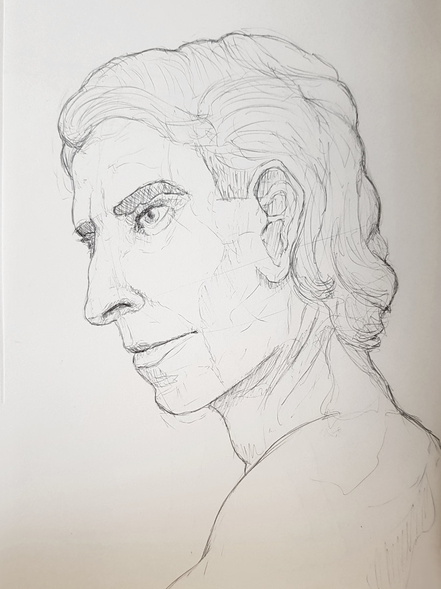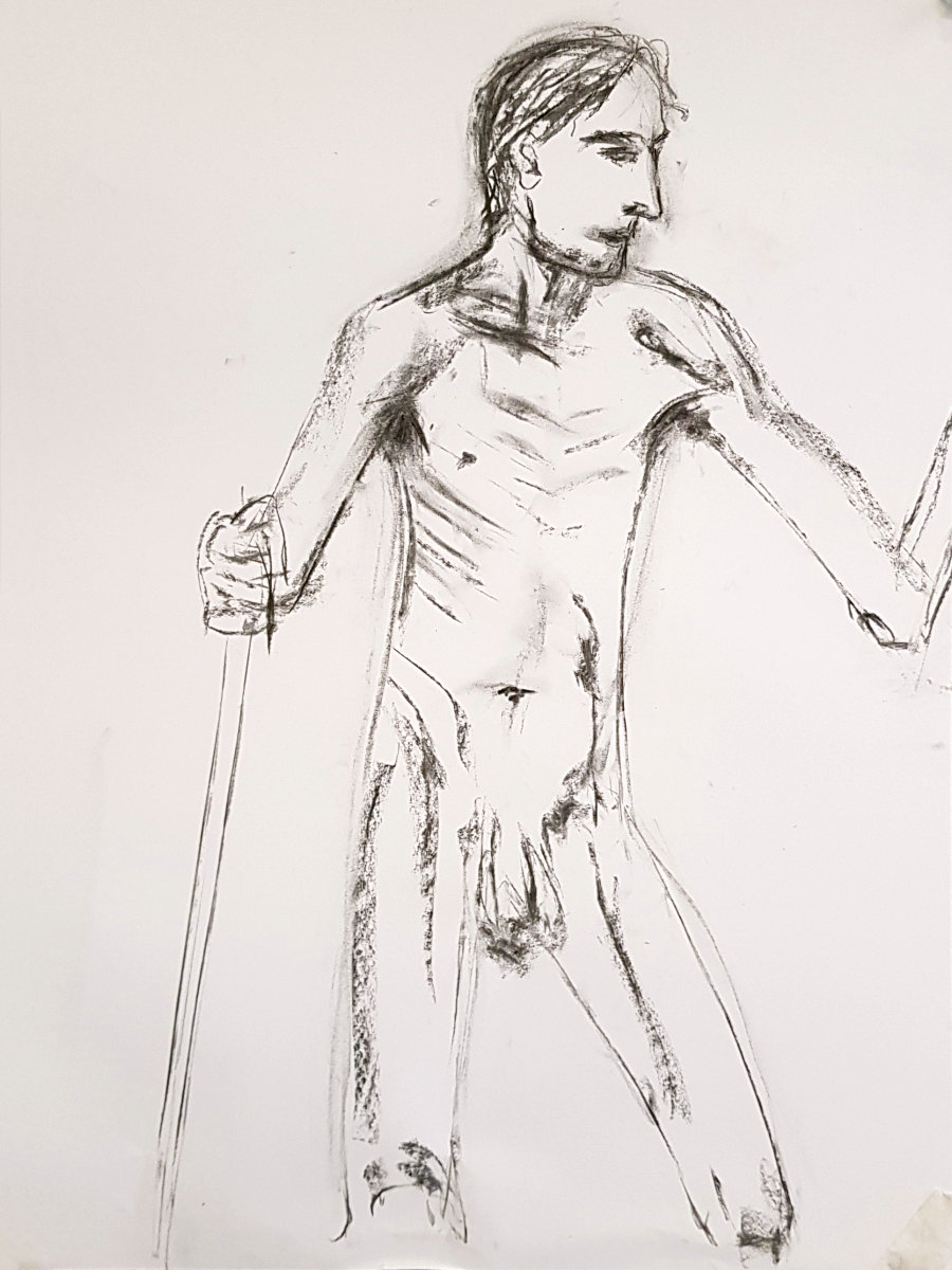 After this frenetic sequence, we completed the first half with two poses of 20-minutes each – back to basics for life drawing traditionalists, and a period of focused study for those who like to exercise their imaginations and draw more than what they see. One artist used this time to represent me as a kind of elf king, resplendent with crown and pencil sceptre; not my usual daywear…