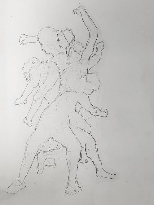 A mug of tea and a couple of digestive biscuits later, we resumed after the break with a 5-minute movement pose. Tim, the life drawing session organiser, called out time checks every 60 seconds while I slowly, slowly, slowly turned 360°, rising, unravelling, stretching, curling, reaching. A couple of artists had murmured low groans on hearing that a movement pose was coming, but others met the challenge magnificently.