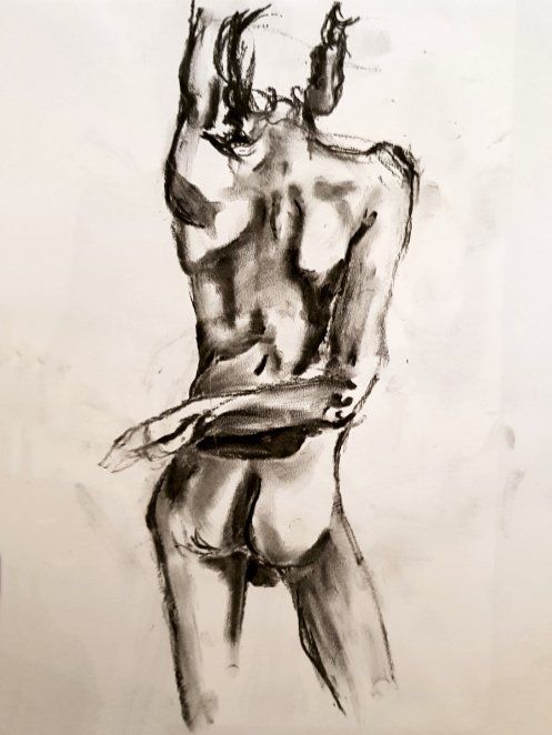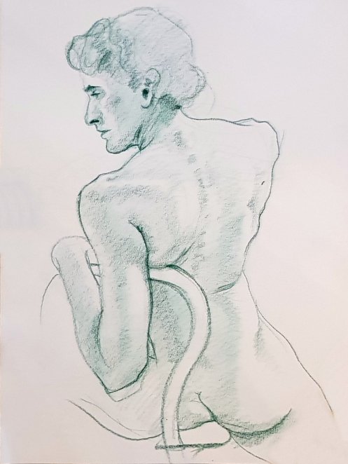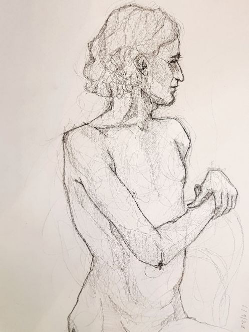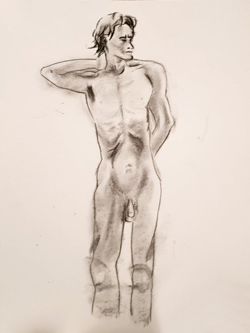 Two poses of 30-minutes concluded our evening’s work. Drawings were spread on the floor for general admiration and, as I roamed about, one woman told me I was the first male model she’d ever drawn. This was only her fifth time life drawing, yet already her work was of a very high standard. Similar for other artists who hadn’t previously drawn me. Reassuringly familiar or refreshingly new, it seems there’s a lot of talent out there.