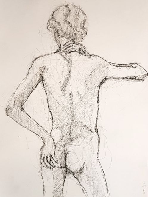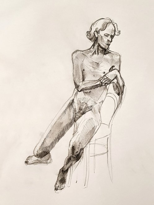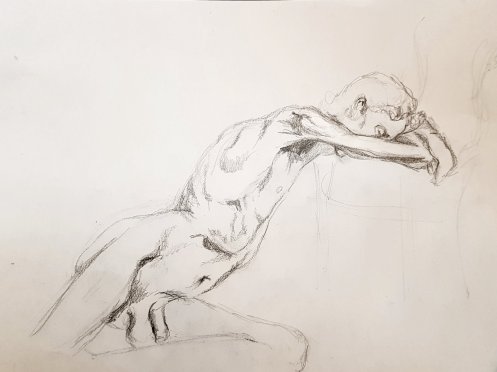 This venue now hosts Adrian Dutton’s life drawing sessions on Thursday evenings. While the space was new to me, the format and many of the artists were reassuringly familiar. I followed the opening pose with three poses of 3-minutes, plus one each of 5, 15 and 20-minutes up to the interval. I took care to protect the weakened leg, but then ended up with dead arms when I reclined with them resting upon a wooden chair.
