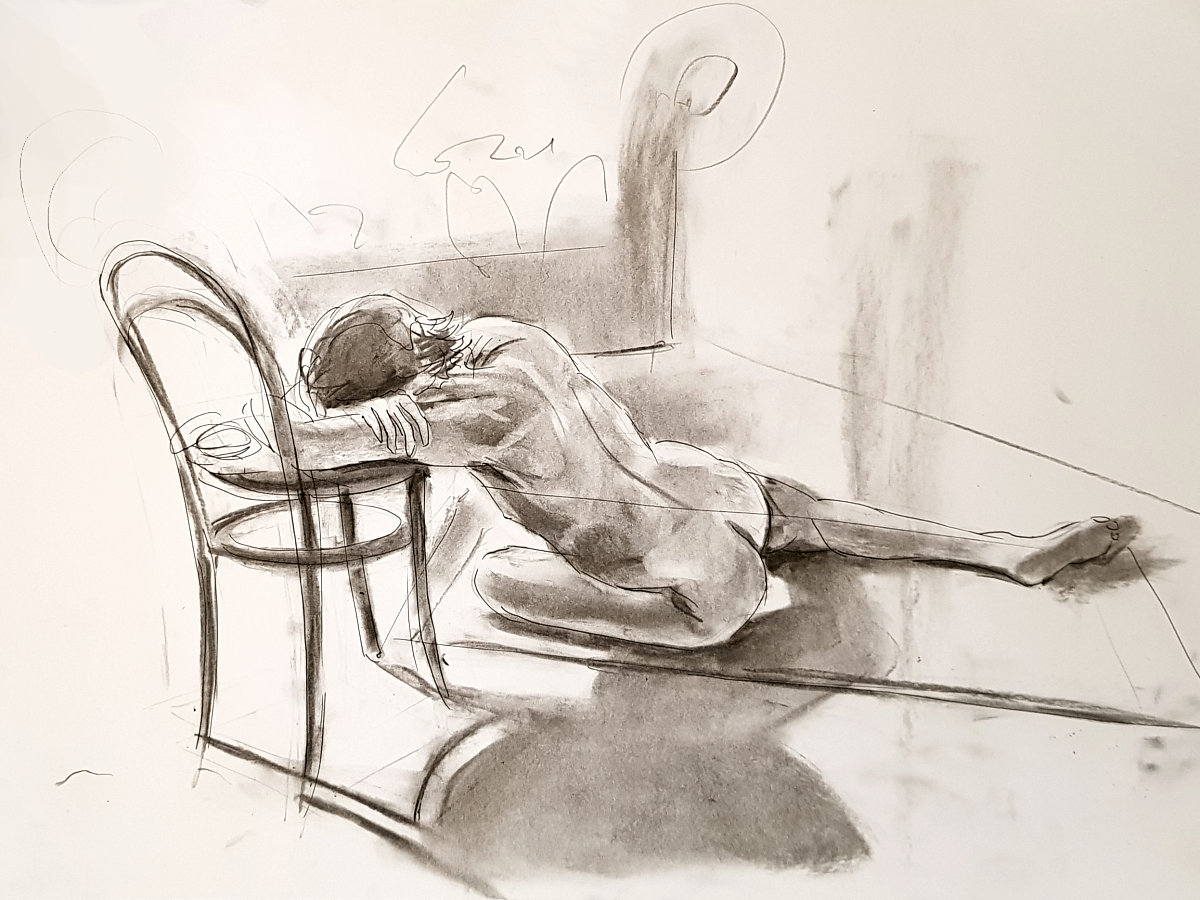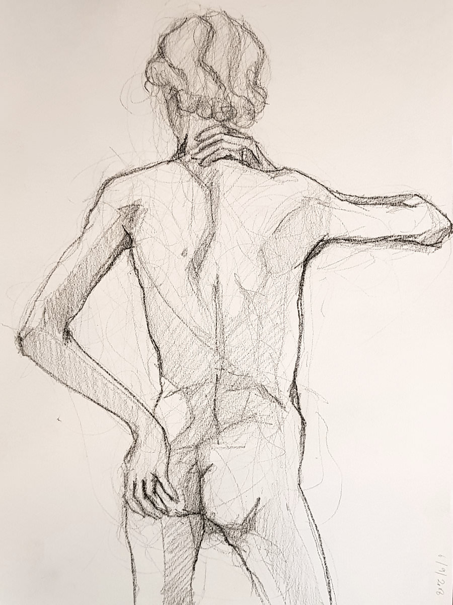 This venue now hosts Adrian Dutton’s life drawing sessions on Thursday evenings. While the space was new to me, the format and many of the artists were reassuringly familiar. I followed the opening pose with three poses of 3-minutes, plus one each of 5, 15 and 20-minutes up to the interval. I took care to protect the weakened leg, but then ended up with dead arms when I reclined with them resting upon a wooden chair.