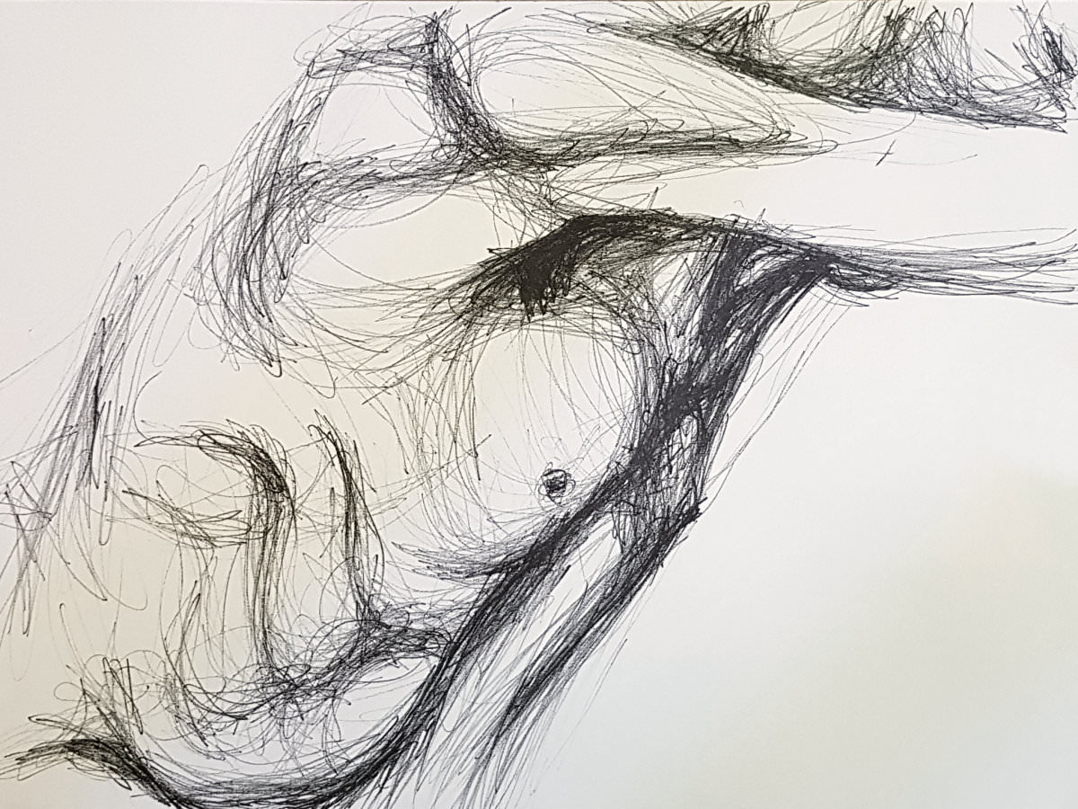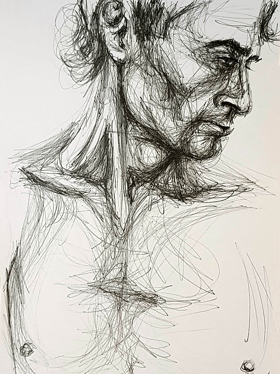 Two poses of 30-minutes concluded our evening’s work. Drawings were spread on the floor for general admiration and, as I roamed about, one woman told me I was the first male model she’d ever drawn. This was only her fifth time life drawing, yet already her work was of a very high standard. Similar for other artists who hadn’t previously drawn me. Reassuringly familiar or refreshingly new, it seems there’s a lot of talent out there.