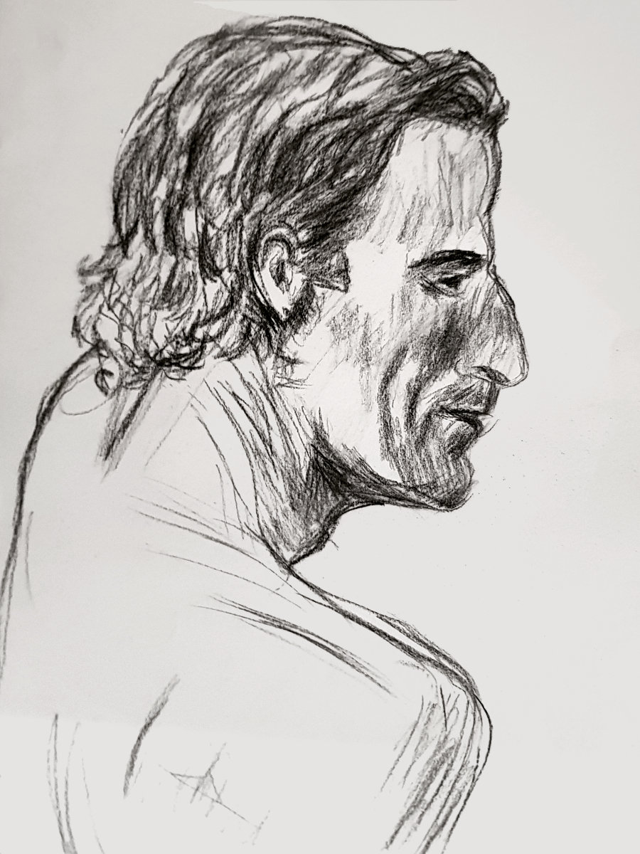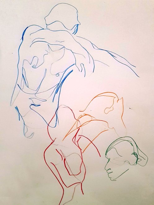 Meanwhile, somewhere downstairs, Catherine was waiting for me to arrive. No alarms however, just ships in the night. Come our 7:30pm start time she sailed into the room surrounded by an ocean of artists. Everybody grabbed art materials and chose a seat. Some had been here earlier, using boards and paper to reserve their favourite vantage point – the art equivalent of beach towels on hotel sunbeds. We started at once.