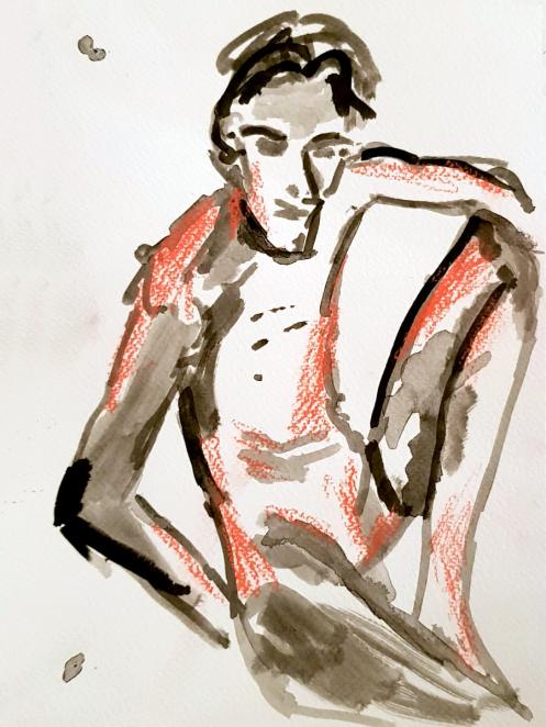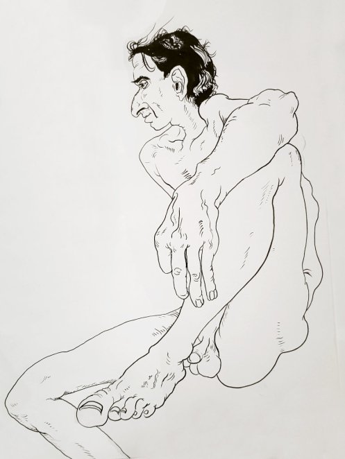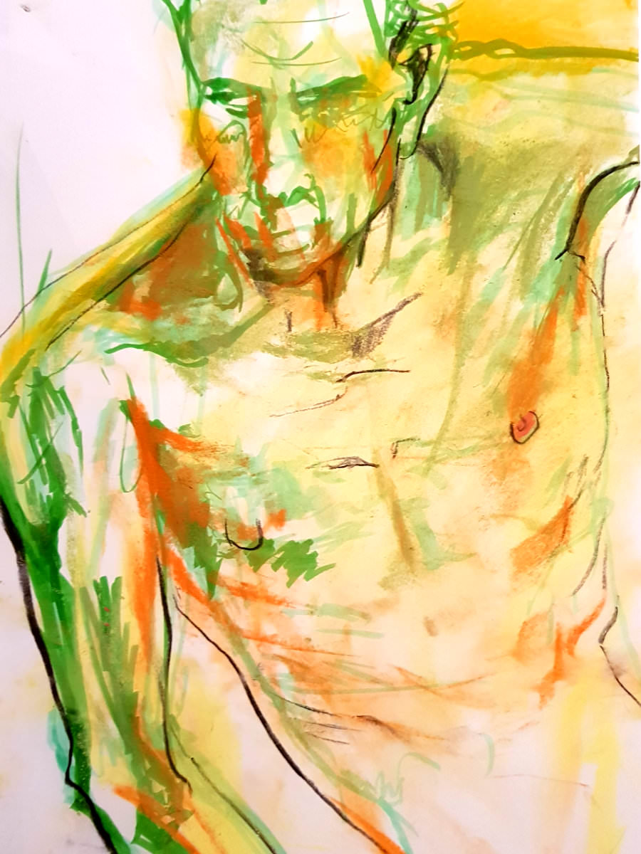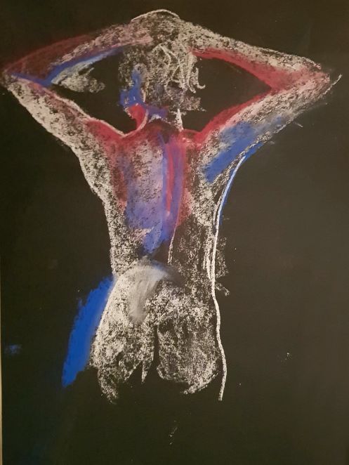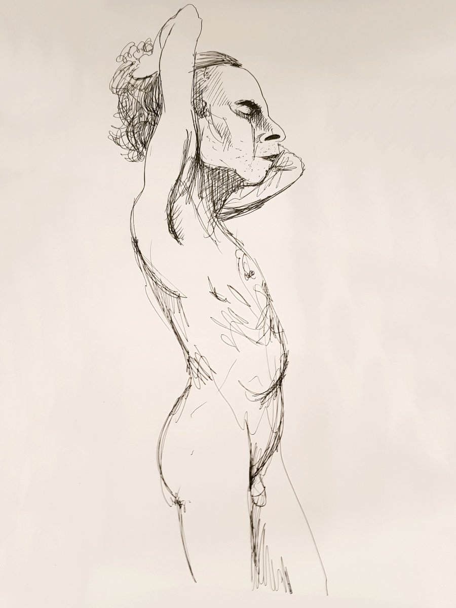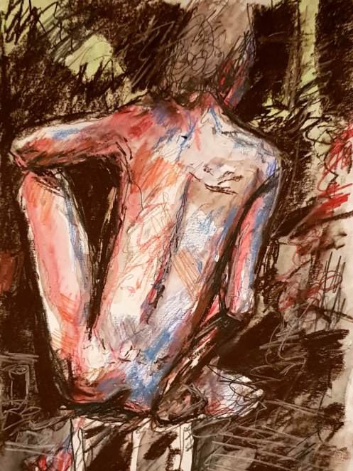 I felt confident the resulting artworks would justify a few extra aches and pains. This is still a great venue. I’d last posed here in July, but my most recent visit was a fortnight ago when Sky News came to film superb model Leonora ‘JiggleChick’ at work, and interview Esther about her Spirited Bodies campaign promoting life drawing to young people as a way of developing body positivity in the social media age. Here’s the clip: