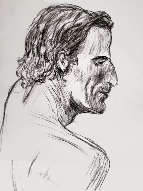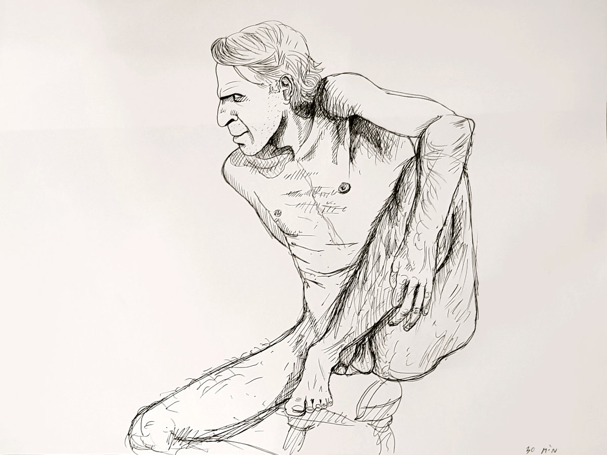 5-minutes, 4, 3, 2, three of 1-minute, three of 30-seconds, then 10-minutes and lastly 8-minutes rounded off a first half of quick-fire poses. When the artists returned from a drinks break, they voted on their pose-time preference for our final half-hour: 10-10-10, 15-15, 10-20, or a single 30-minute pose. Unexpectedly they opted for one long pose. Possibly unprecedented! So I sat on a stool and rewarded them with lots of angles.