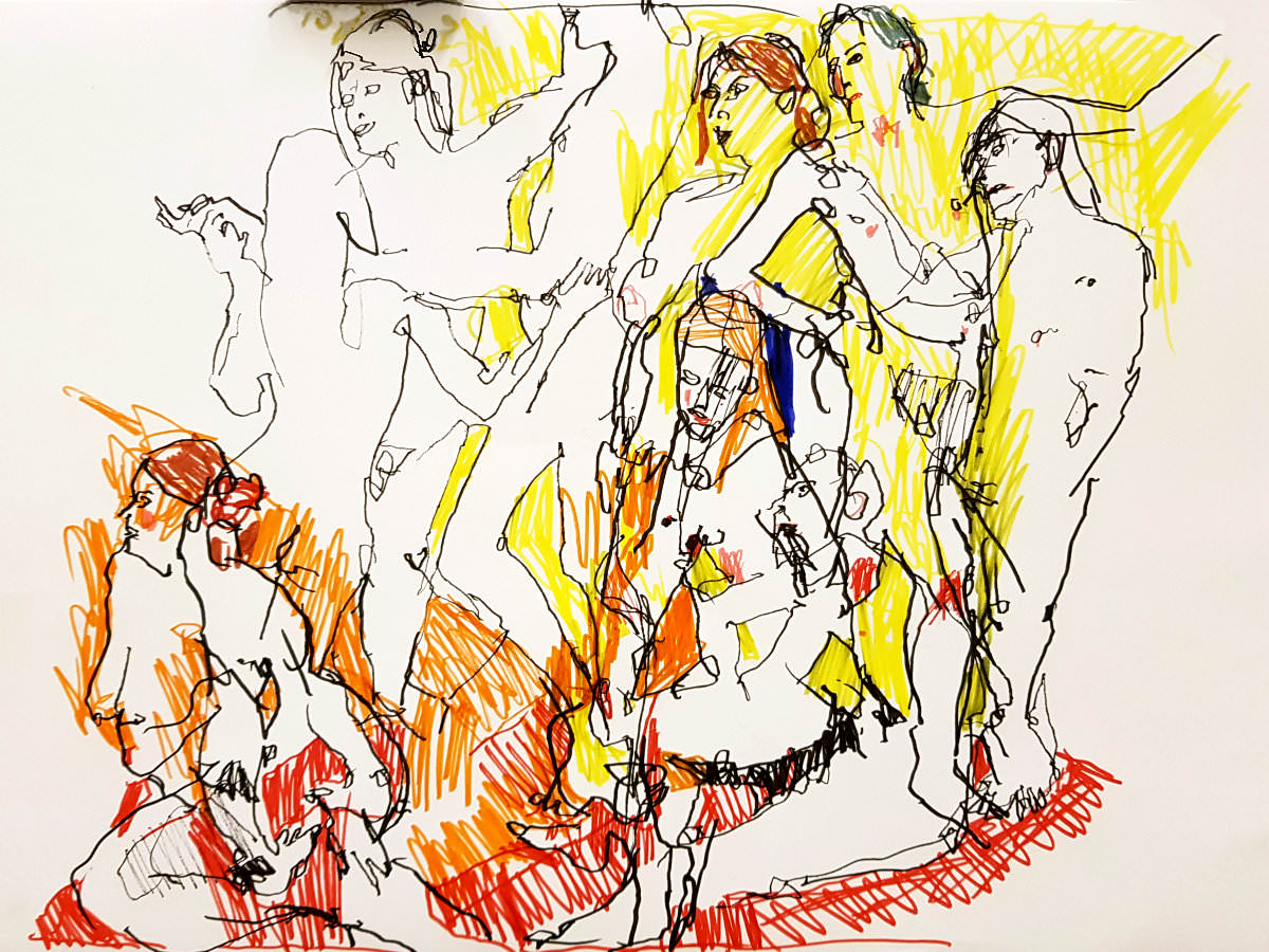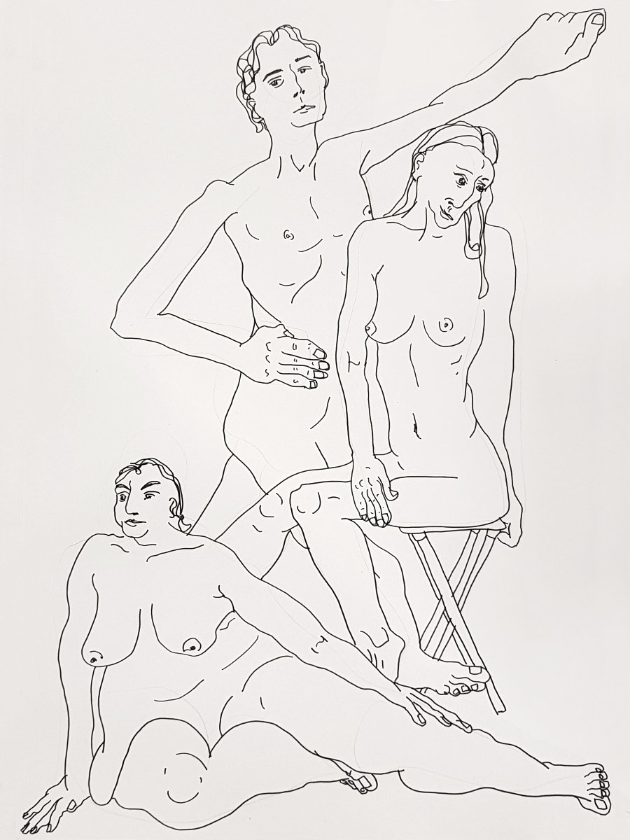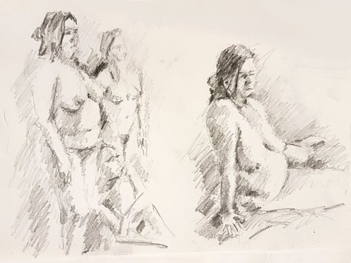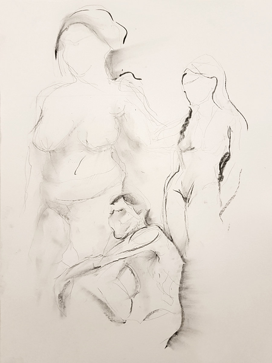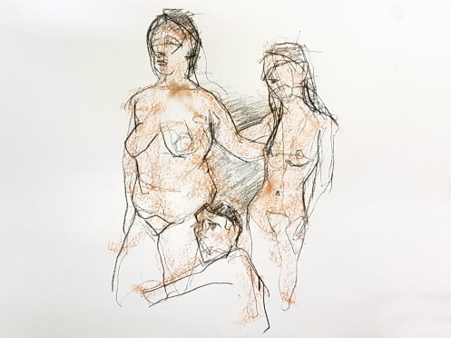 Anne of London Drawing had introduced the session, explaining the presence of a TV camera and making sure no-one felt uncomfortable. After warming up with Valentina’s elegant stretch for 15-minutes, the artists’ next challenge was drawing three times as many models in just two-thirds the time. Esther and I undressed and joined Valentina for a first trio pose of 10-minutes, then another of 10-minutes, and one of 15-minutes.