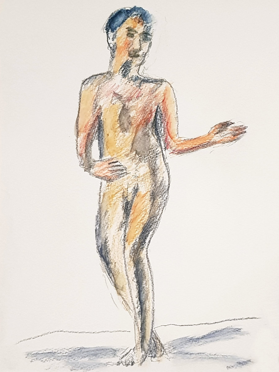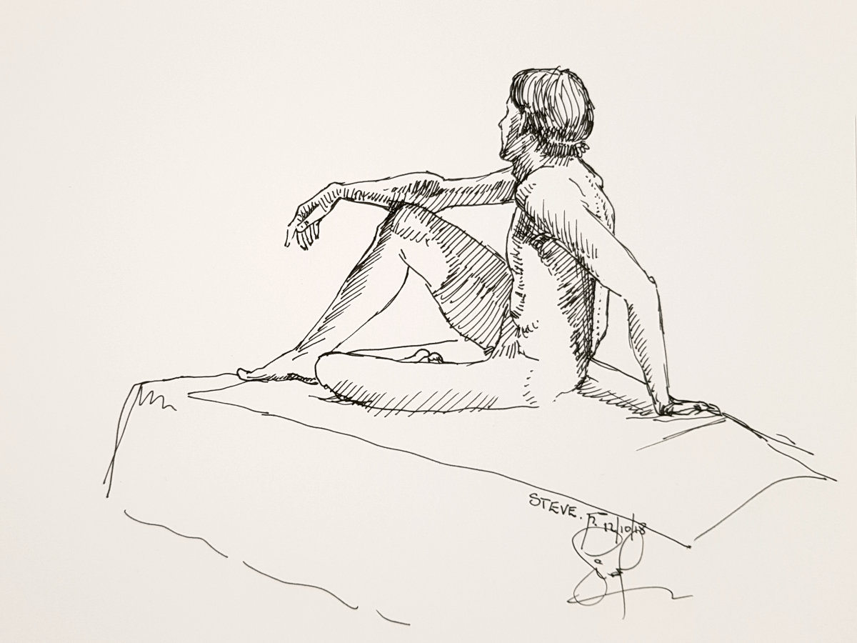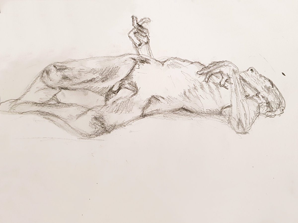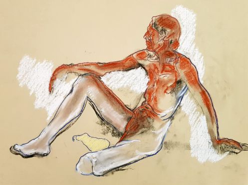 Finally a nice lie down. Well, not absolutely deliciously sumptuously nice as I’d put a twist in my torso and kept an arm, hand and index finger raised for vertical variety. My eyes were closed but there was little chance of sleep. Upon reanimating at the end, it was a pleasure to see such a range of materials had been used to capture my poses: fine pen and pencil work, scratchy charcoal, pastels both pale and vibrant, plus some bright splashes of watercolour. Warming feedback too. Lovely folk.