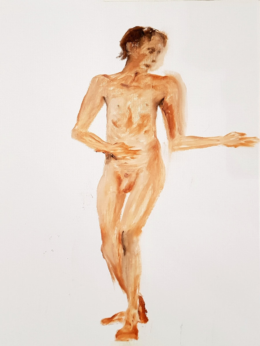 I was pondering the first of my four 30-minute poses for this evening at Mall Galleries when a regular of Hesketh Hubbard Art Society asked me, “Do you know Nijinsky?” Presuming she didn’t mean the racehorse, I replied in the affirmative and together we consulted Google for a specific pose of his that she had in mind. Fortunately it wasn’t a classical ballet pose, and even more helpfully I was asked to flatten it in the style of Assyrian sculpture reliefs she’d seen in the British Museum. Well, why not…