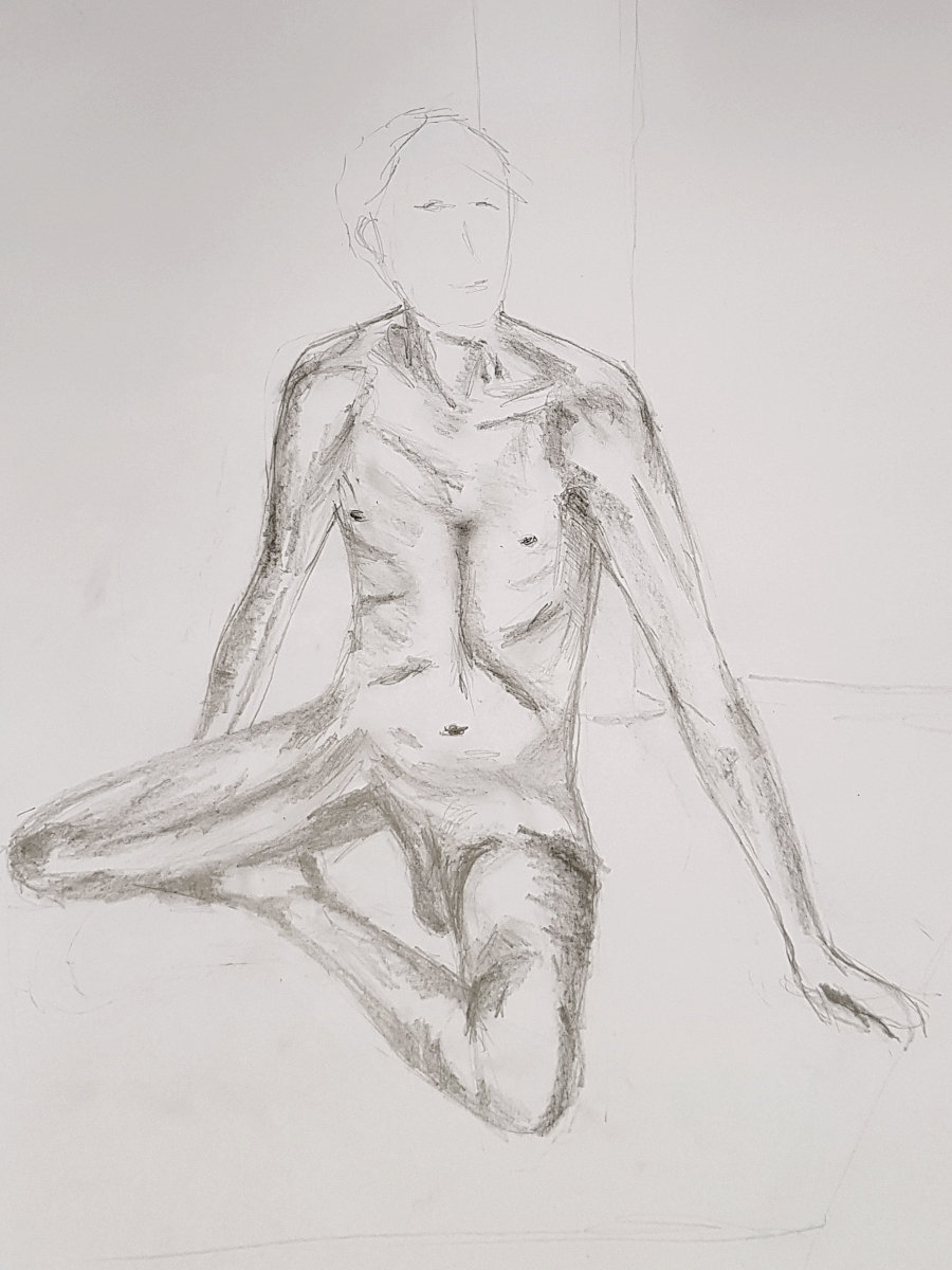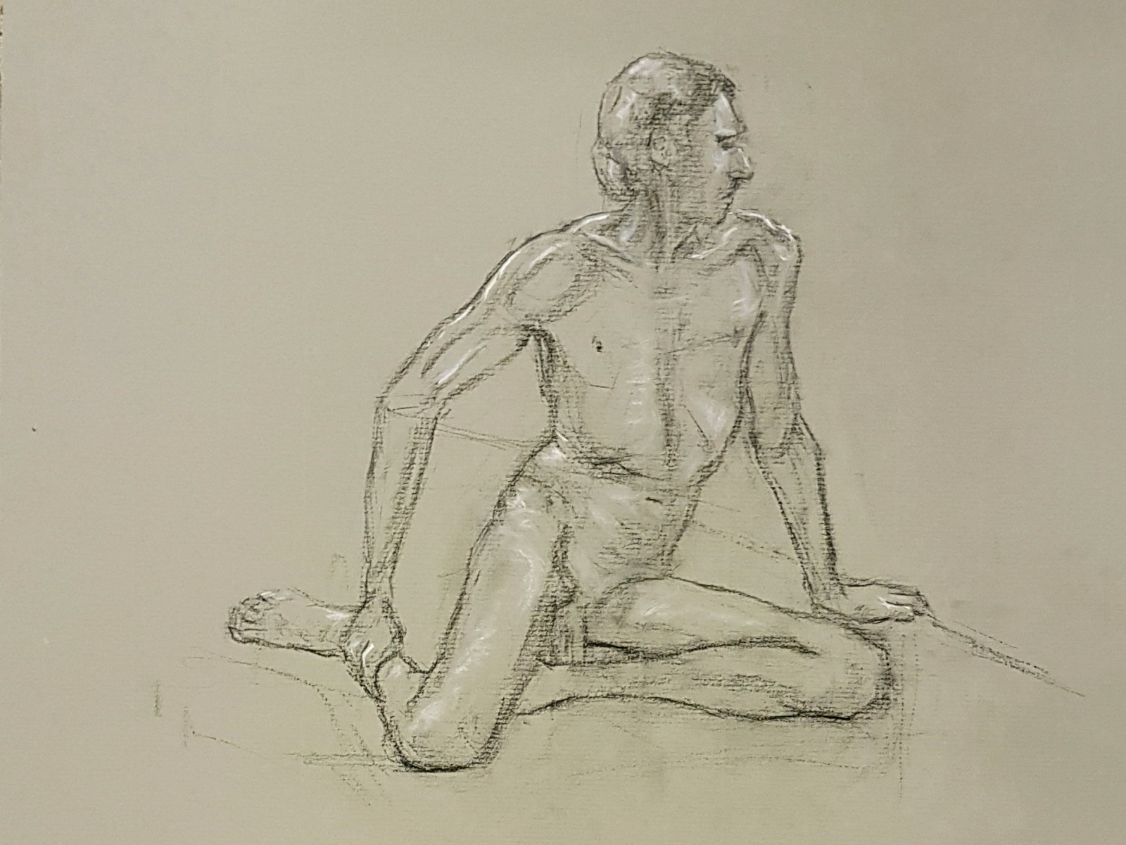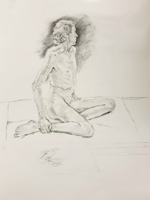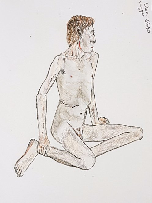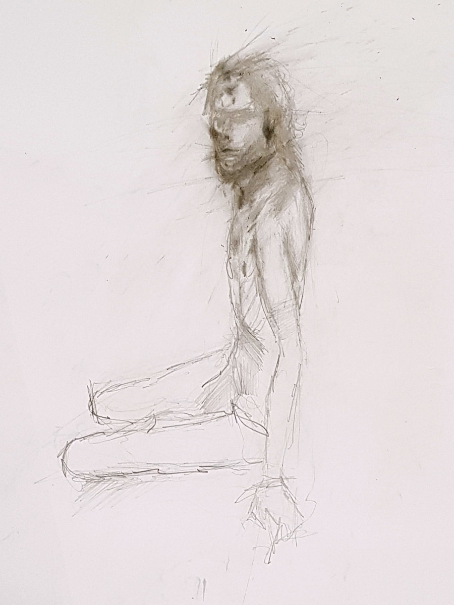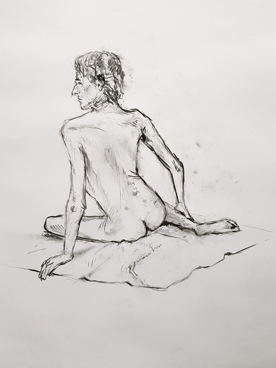 Evidently the room used for life drawing at the Garrett Centre had received a modest makeover since I was last there in June. Most notably the carpet had gone and been replaced with a hard surface. It worried me slightly as, purely at a psychological level, the impression was of a starkly colder space. I needn’t have been concerned, though, as a hefty gym mat, a cushion, my sheet and two heaters kept me very cosy.