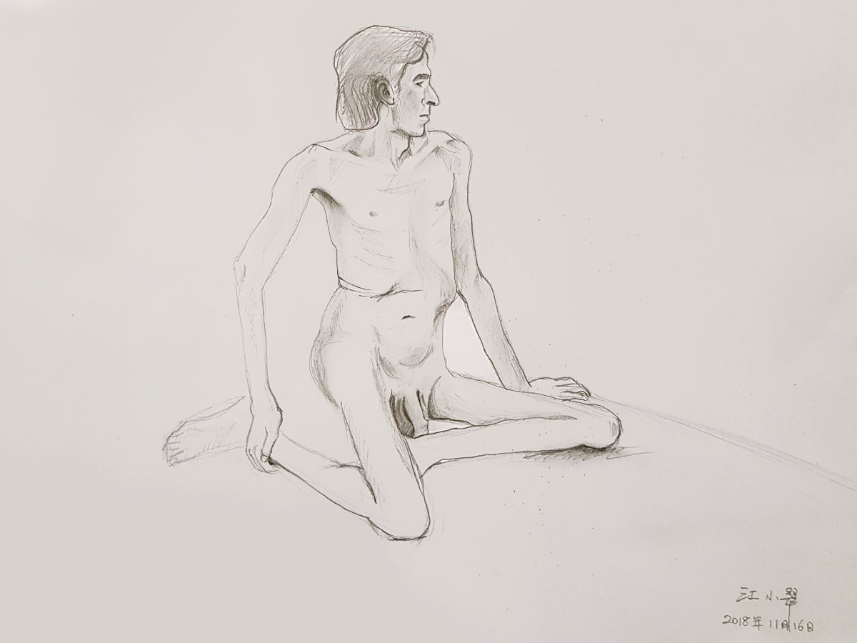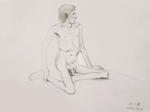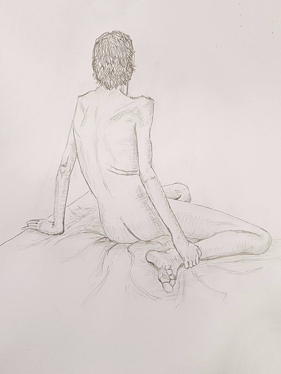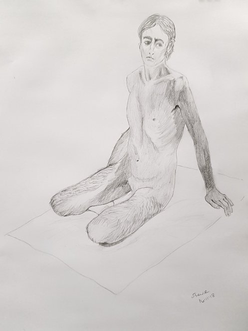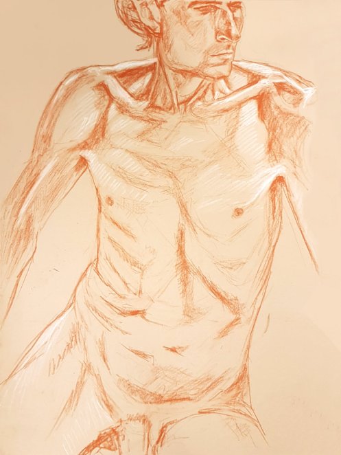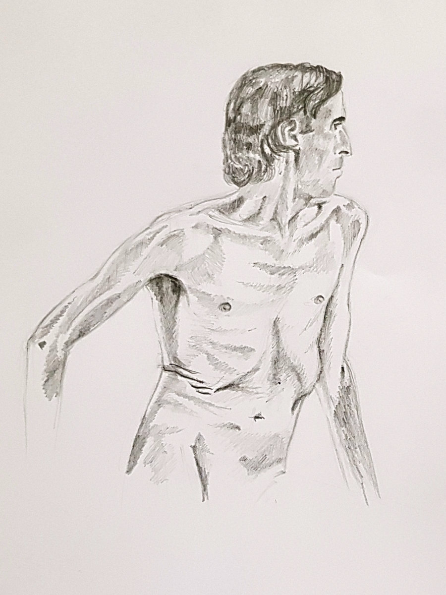 Evidently the room used for life drawing at the Garrett Centre had received a modest makeover since I was last there in June. Most notably the carpet had gone and been replaced with a hard surface. It worried me slightly as, purely at a psychological level, the impression was of a starkly colder space. I needn’t have been concerned, though, as a hefty gym mat, a cushion, my sheet and two heaters kept me very cosy.