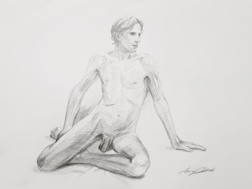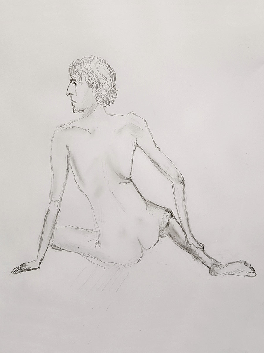 Another difference for this long pose session is that I would be modelling in the round rather than with my back to a wall. The circle of chairs filled to capacity in time for us to begin with four shortish warm-up poses: three of 5-minutes and one of 8-minutes. I made sure that for all of these I was facing the side of the room that was fated to see mostly my back for the remainder of the evening.