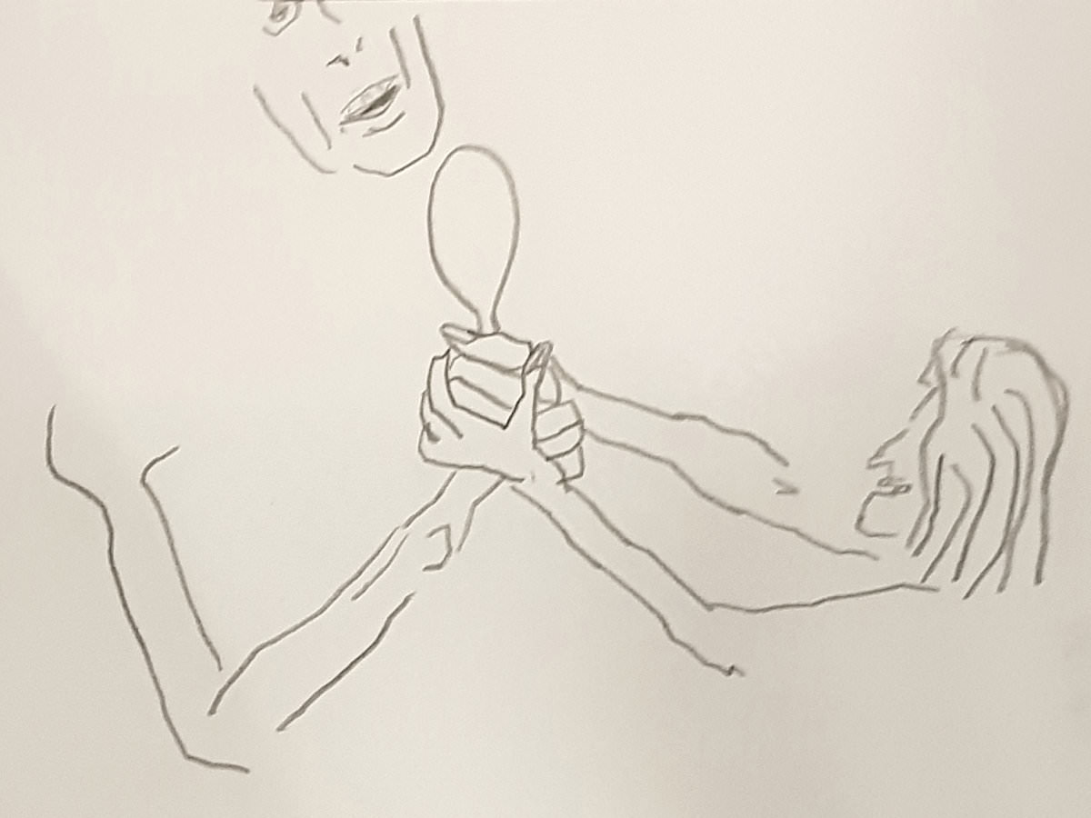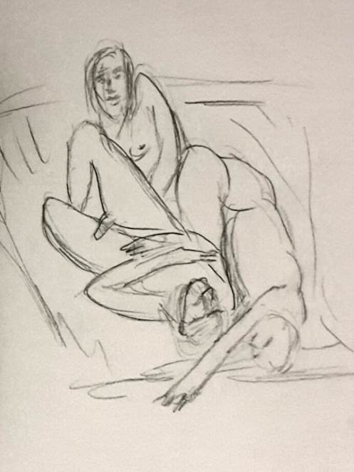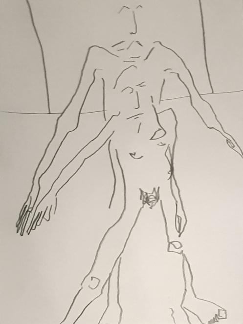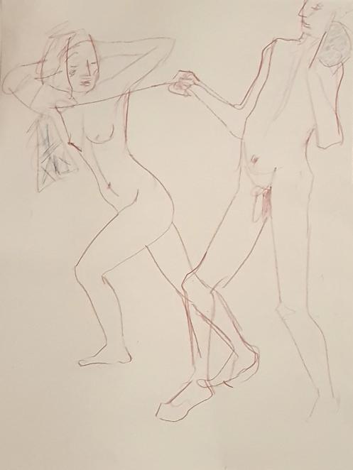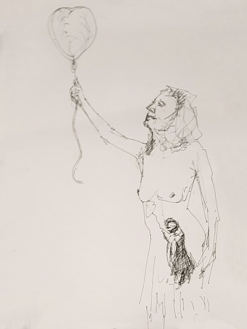 After a half-hour break for food, Esther resumed with a short warm-up pose – our area still lacked the warmth we were promised for this, the first day of December. Her pose was that of a small girl holding a red love-heart balloon, while her legs were paper that had been half cut to ribbons. An extra clue was drawn on the paper itself…
