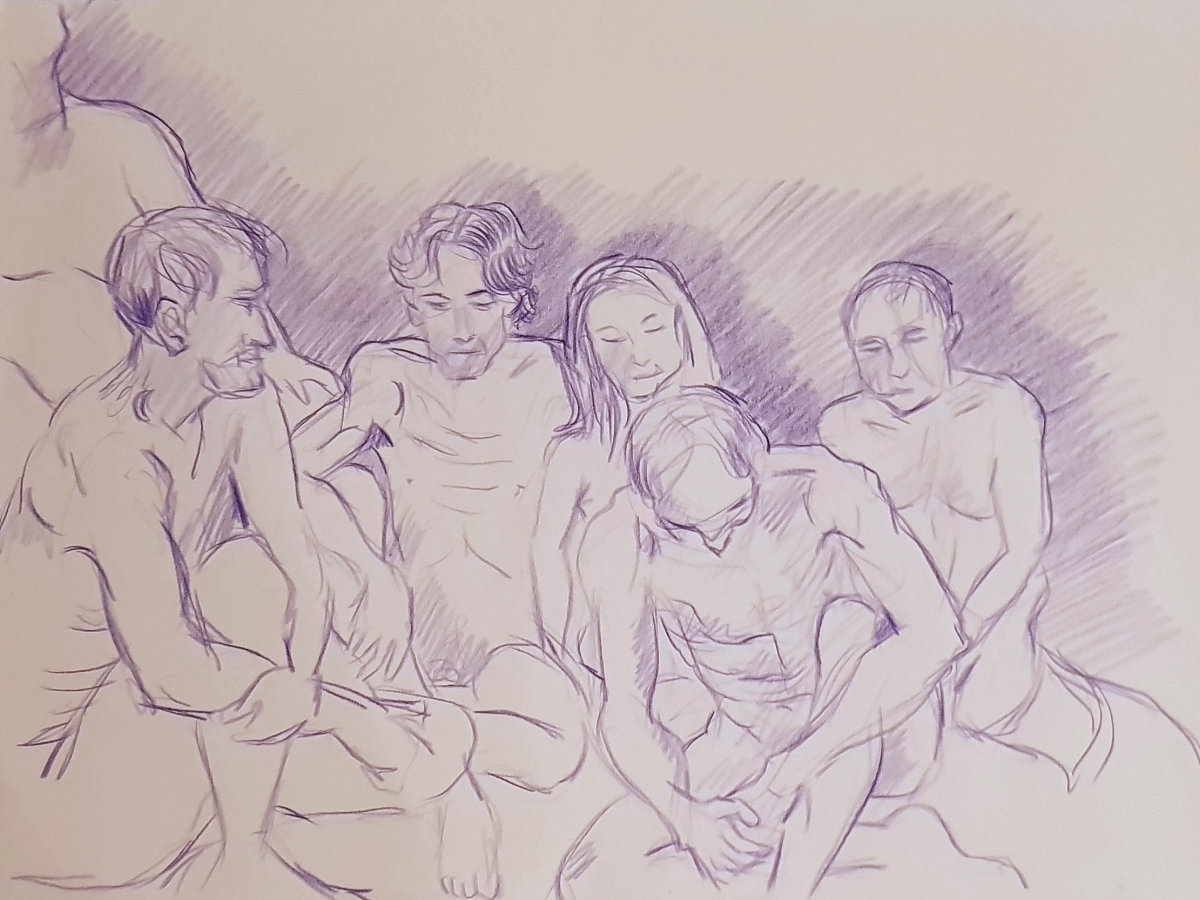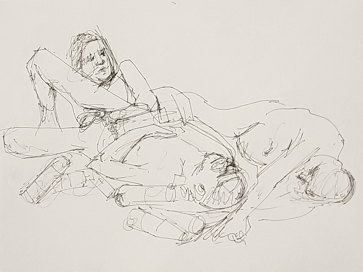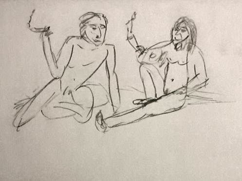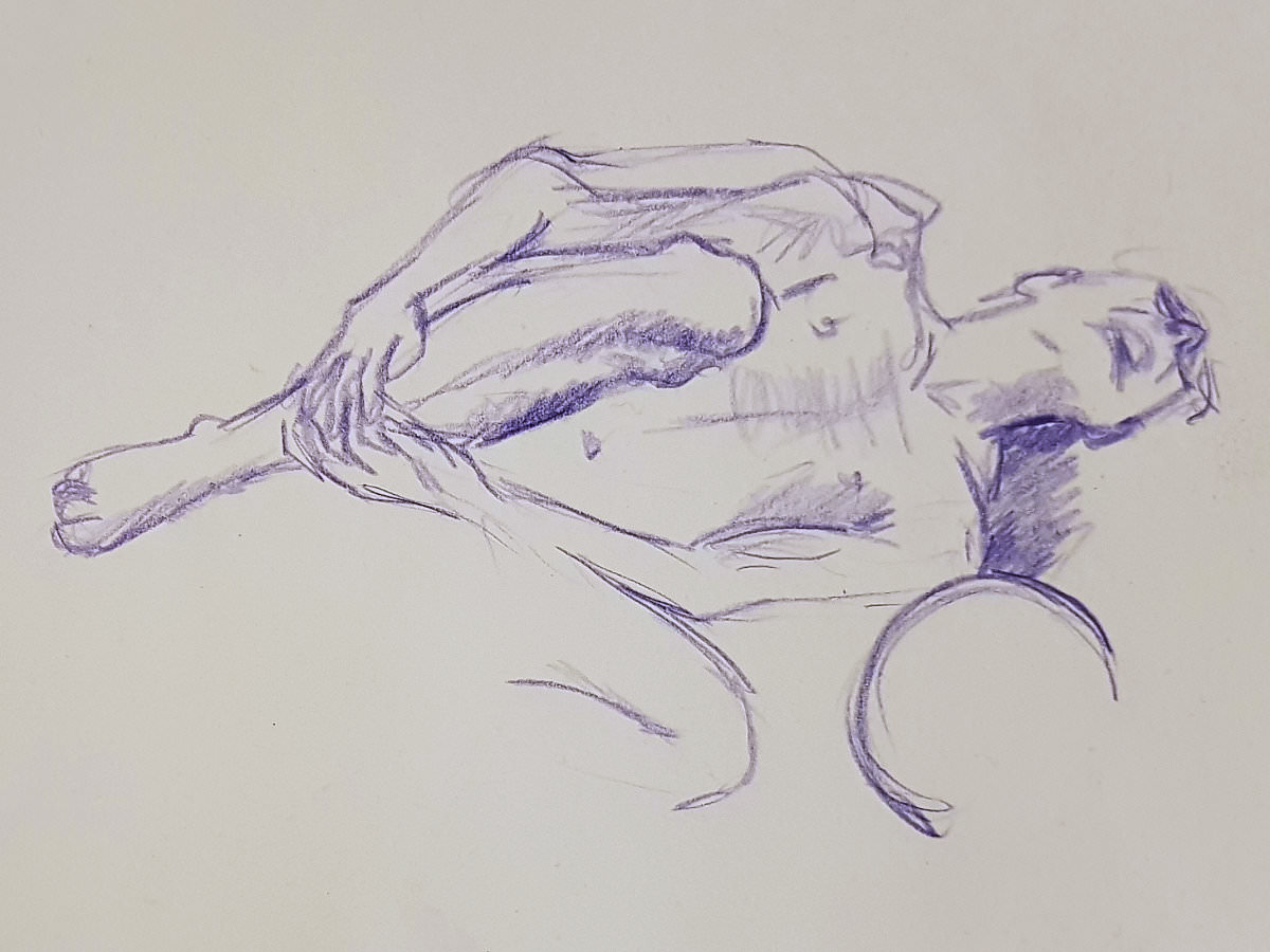 The final pose of the day was reserved for perhaps the biggest news story of them all. Peter, Esther and Adrian lay down on the blue sheet, a tide of humanity amidst a sea of plastic bottles that Lucy and I scattered on and around them. It was the end of this drawing session; we can only hope it doesn’t represent the end of so much more…