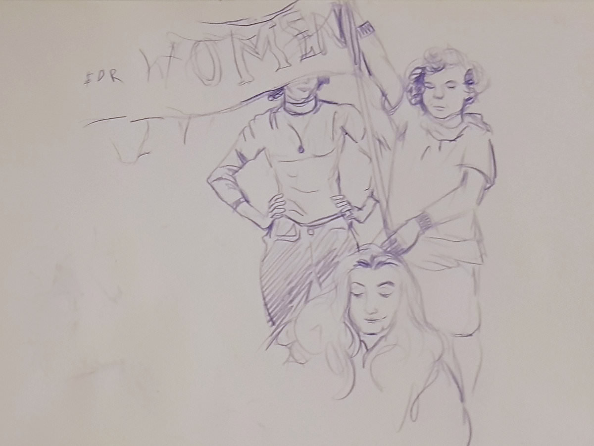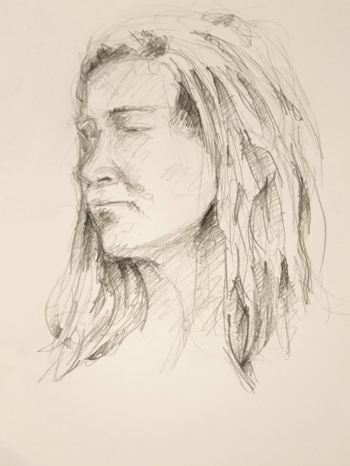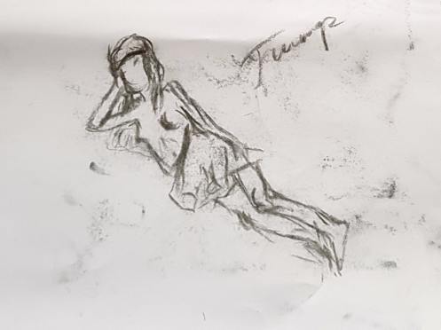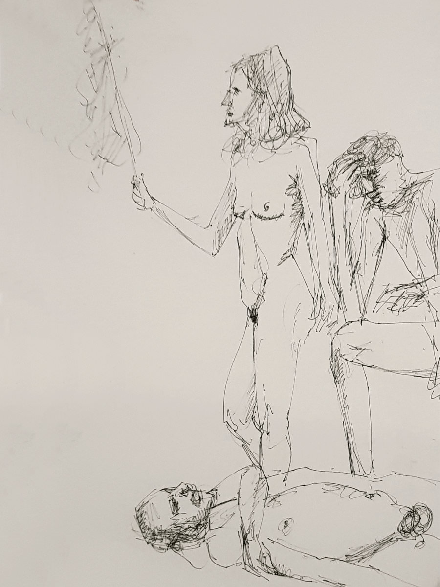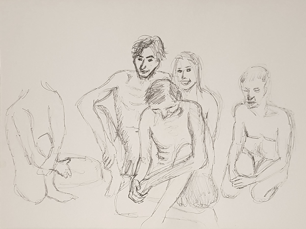 The final pose of the day was reserved for perhaps the biggest news story of them all. Peter, Esther and Adrian lay down on the blue sheet, a tide of humanity amidst a sea of plastic bottles that Lucy and I scattered on and around them. It was the end of this drawing session; we can only hope it doesn’t represent the end of so much more…
