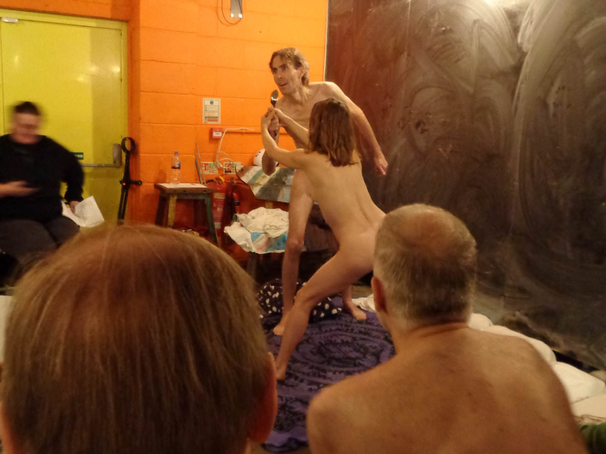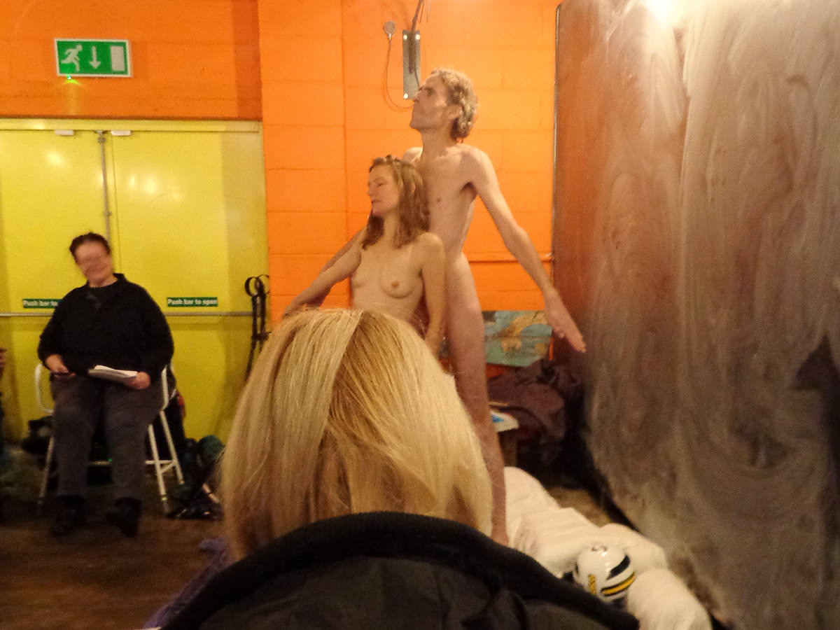 This pose was another symbolic one so recognition was trickier. I stood in the manner of the traditional sign for a male toilet. Esther then set her female body directly in front of me, but making only half the same sign, so together we were neither fully Steve nor fully Esther. We then consulted the artists on what they thought of this Act…