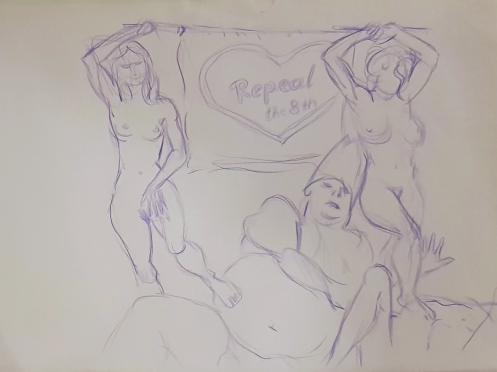 Two new volunteers undressed and joined us for our next pose. Esther and Lidia held up a large banner that demanded ‘Repeal the 8th‘ whilst Andy and I, wearing bishops’ mitres, lay defeated beneath their feet. Lidia delivered an impassioned speech on the significance of this news story – both for the country in question and for all women…